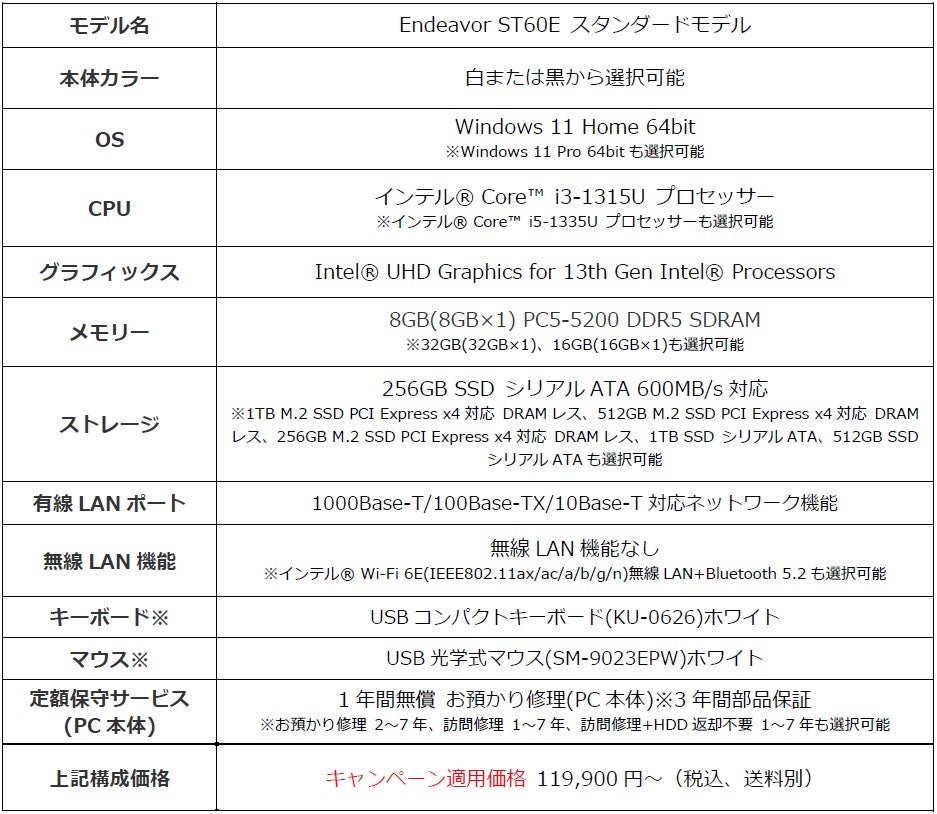『Endeavor ST60E』の仕様一覧および詳細は、ホームページでご確認ください。