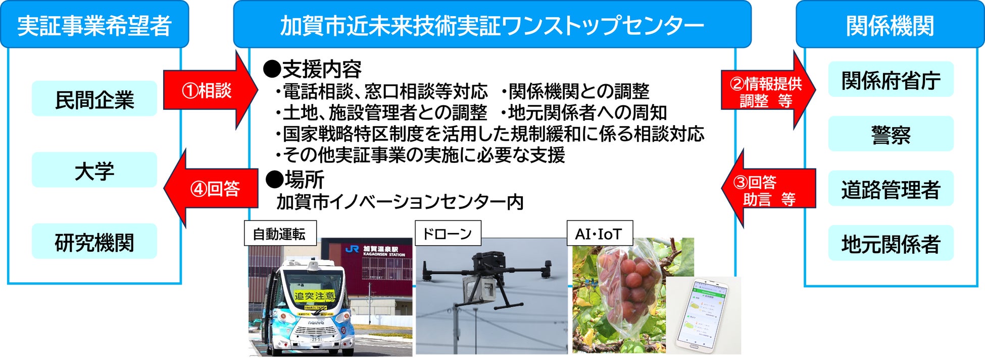 国家戦略特区 加賀市は、近未来技術の早期実装の促進及び新規産業の創出を目指して、国(内閣府、警察庁、総務省、経済産業省、国土交通省)と共同で「加賀市近未来技術実証ワンストップセンター」を令和6年10月25日に開設します。本センターは、令和6年10月23日に内閣総理大臣の認定を受けて設置されたもので、円滑な実証事業の実施をワンストップでサポートします。「こんな実証がしたい」、「実証したいけどどんな手続が必要か分からない」などありましたら、ぜひ加賀市にご相談ください!