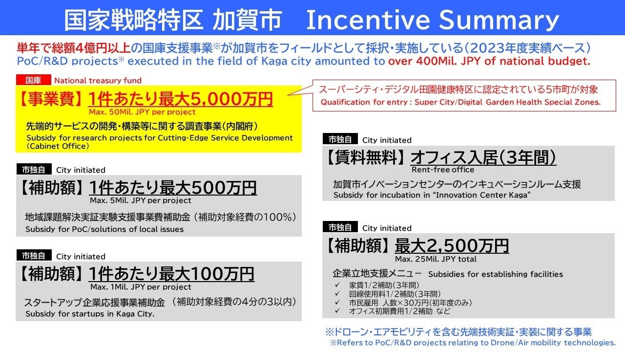 なお加賀市ではイノベーションを推進するために地域課題解決や企業誘致に関係する種々の事業支援を、これまでに数々行っています。特に、国の補助金等を活用して加賀市をフィールドに取り組む事業の総額(民間主体の事業も含む)は、2023年度単年ベースで4億円を超えています(加賀市調べ)。
