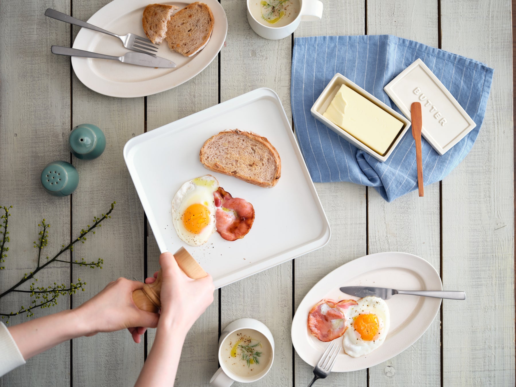 カラーは一般的な食器にも馴染みやすく、テーブルコーディネートがしやすいホワイトを採用。まるで焼けるお皿のようにお使いいただけます。また、食材をより鮮やかに見せてくれるので、朝食やお菓子作りに最適です。