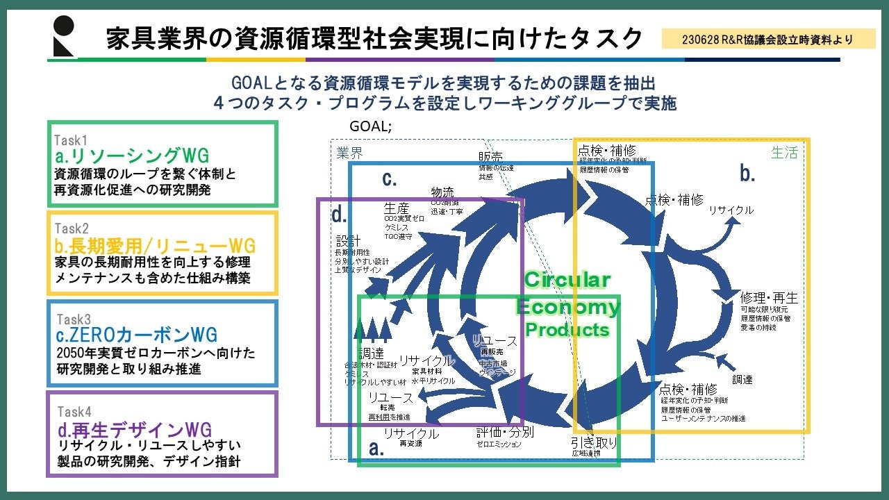 R&R協議会は、設立当初より4つのタスク【リソーシング】【長期愛用】【Zeroカーボン】【再生デザイン】を掲げ、家具インテリア業界共通の課題である、不要家具の引き取り・再利用・再資源化などの資源循環や、森林の生態系保全、CO2排出削減など、環境負荷の少ないサプライチェーンの構築とサーキュラーエコノミーの実現を目指しています。本年度よりイケア・ジャパン株式会社他8社も加わり現在総勢44社に拡大。家具製造、販売、物流及びIT企業による垂直連携により業界全体でタスクに取り組んでおります。