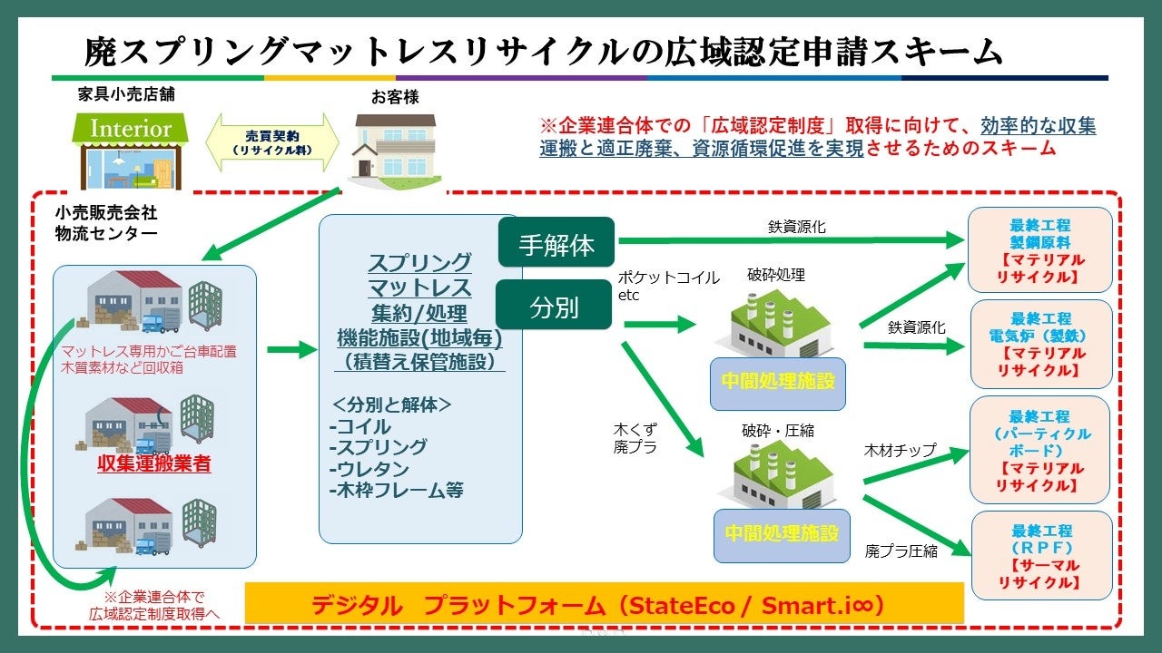 家具インテリア リサイクル協会の設立は、廃棄物の処理及び清掃に関する法律(廃掃法)の特例制度「広域認定制度」の申請への前提要件であり、当協会の体制を整え、廃スプリングマットレスを主としたベッドリサイクル事業を、デジタルプラットフォームを活用したスキーム(下図参照)で推進していきます。また、これを皮切りに、不要家具の引き取り・再利用・再資源化などの資源循環型社会への貢献を、業界全体で捉える事業活動へと進化させていきます。