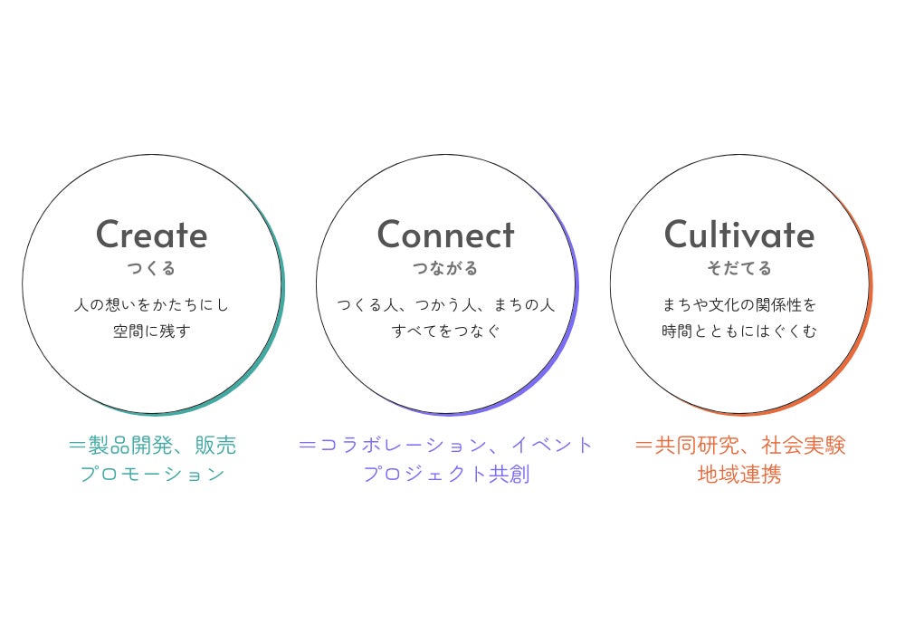 「Create(つくる)」「Connect(つながる)」「Cultivate(そだてる)」という3つのCを軸に、プロジェクト単位でまちづくりに関する取り組みを展開