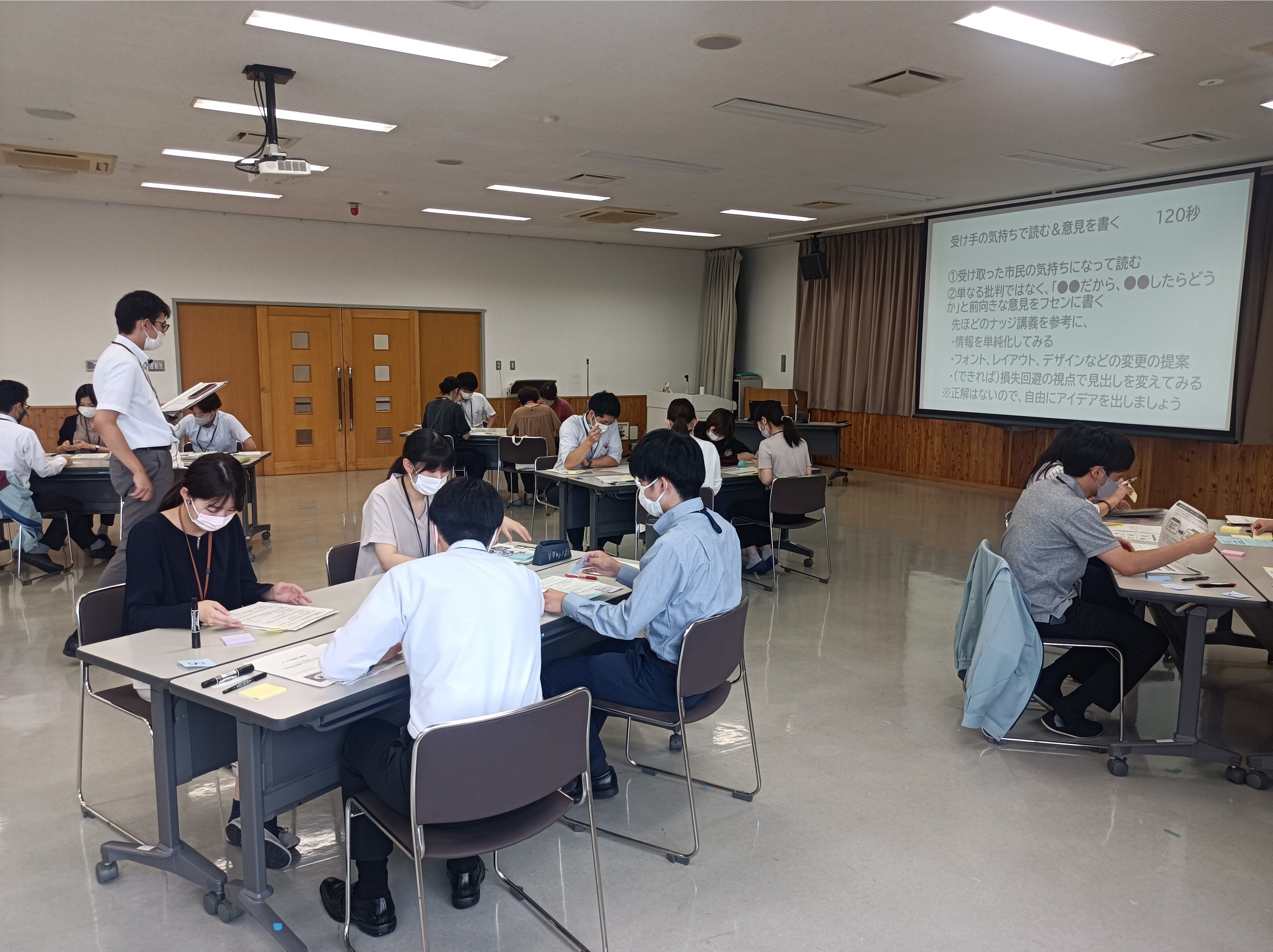 ナッジ理論の基礎的講義、市民向けのお知らせ文書やチラシなどを見直すグループワーク、ワードやパワポ操作のポイント紹介