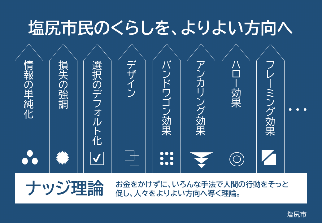 ナッジ理論は、平成29年にノーベル経済学賞を受賞した、シカゴ大学のリチャード・セイラー教授が提唱した概念です。ナッジ(nudge)とは「注意や合図のために肘(ひじ)で人を軽くつつく」という意味。行動経済学の知見を使って、肘で軽くつつくように、それとなく望ましい行動を選択するように促すことを指します。職員の創意工夫が生かしやすく、低コストの手法として、横浜市などの自治体や、環境省や厚生労働省などの省庁で活用されています。 塩尻市総務部税務課でも、昨年度からナッジ理論を活用。今年7月には全国の自治体職員が集まる集合研修(2泊3日)に若手職員を派遣し、ナッジ理論の技術習得に努めてきました。