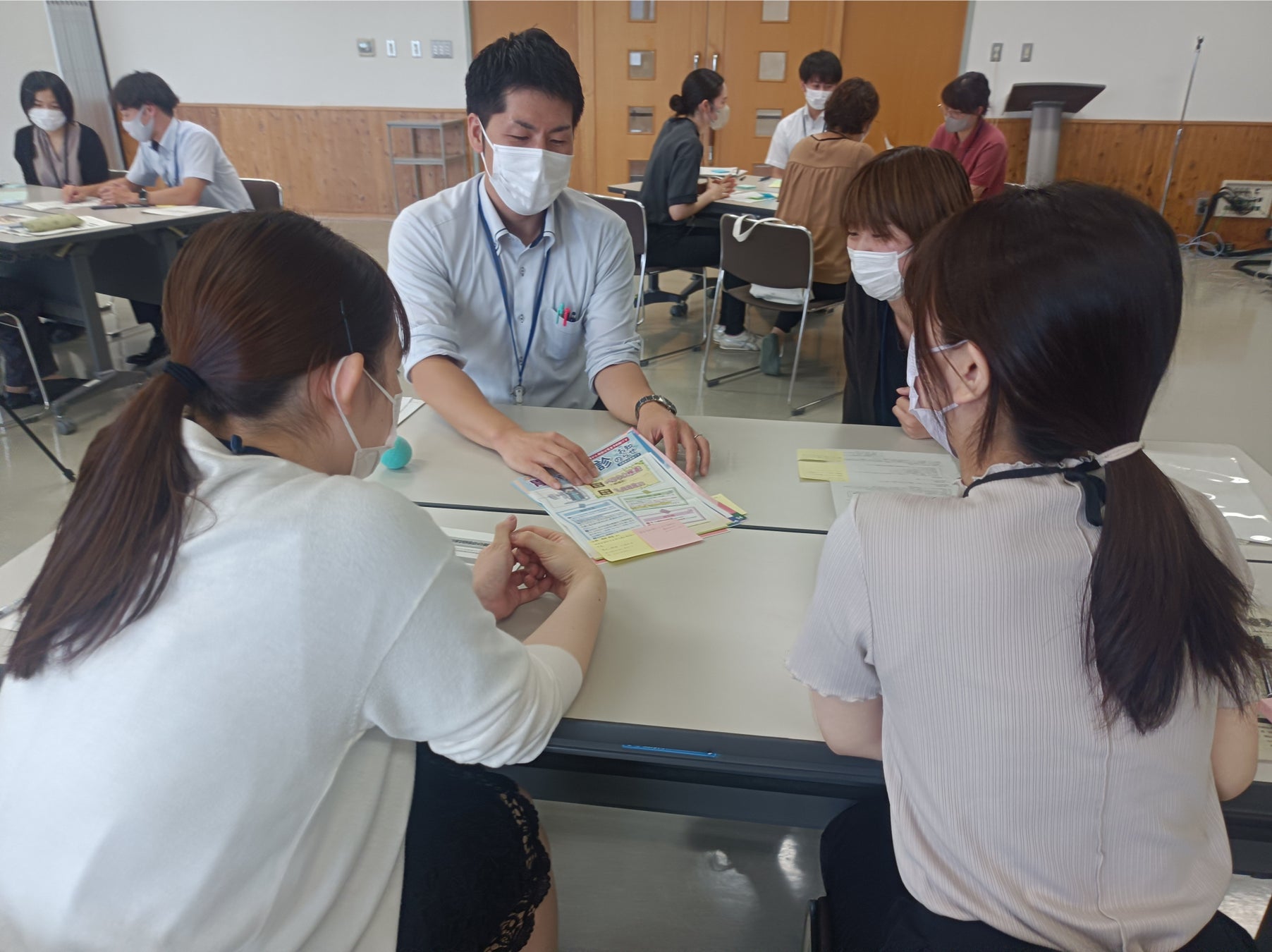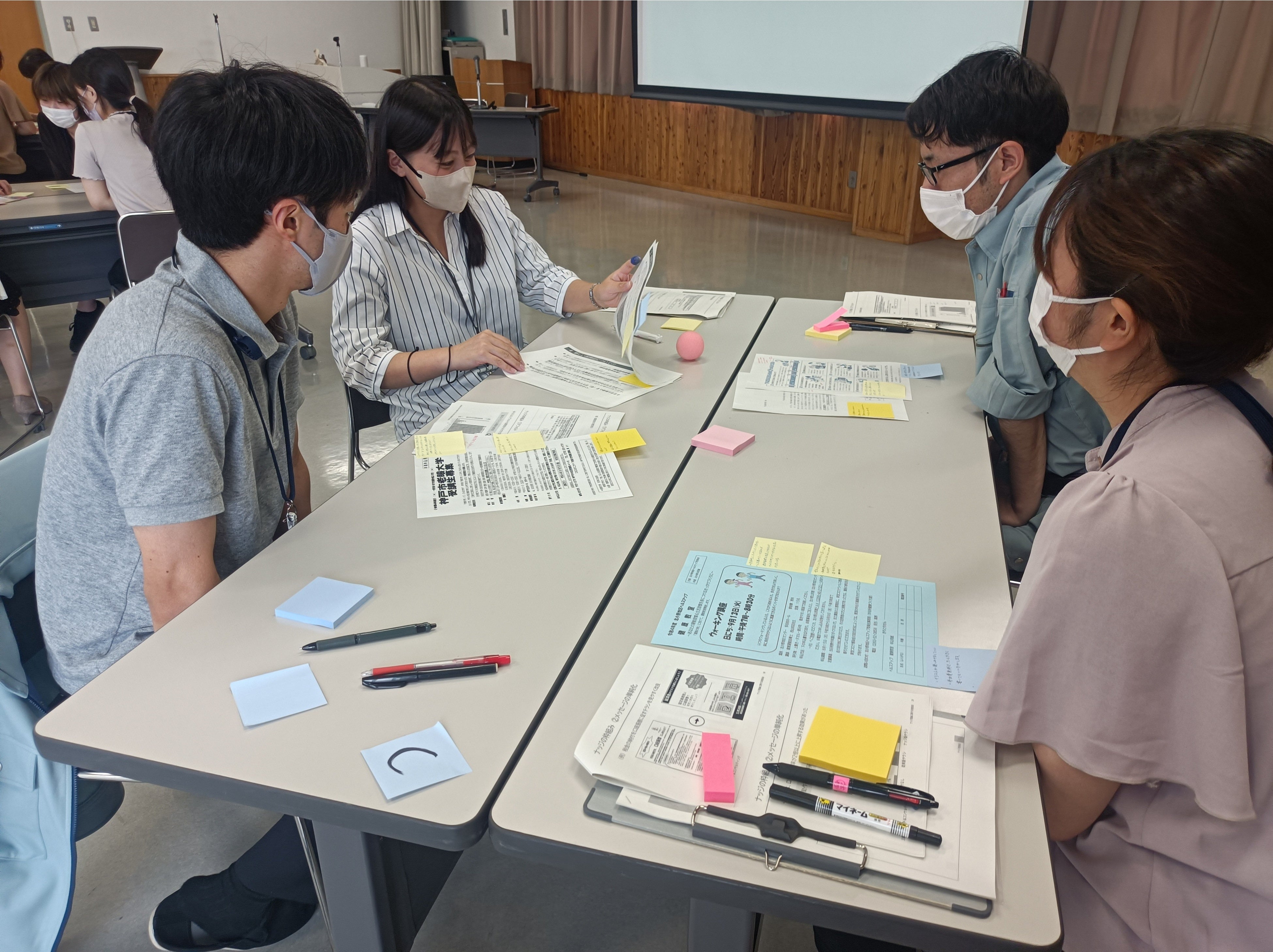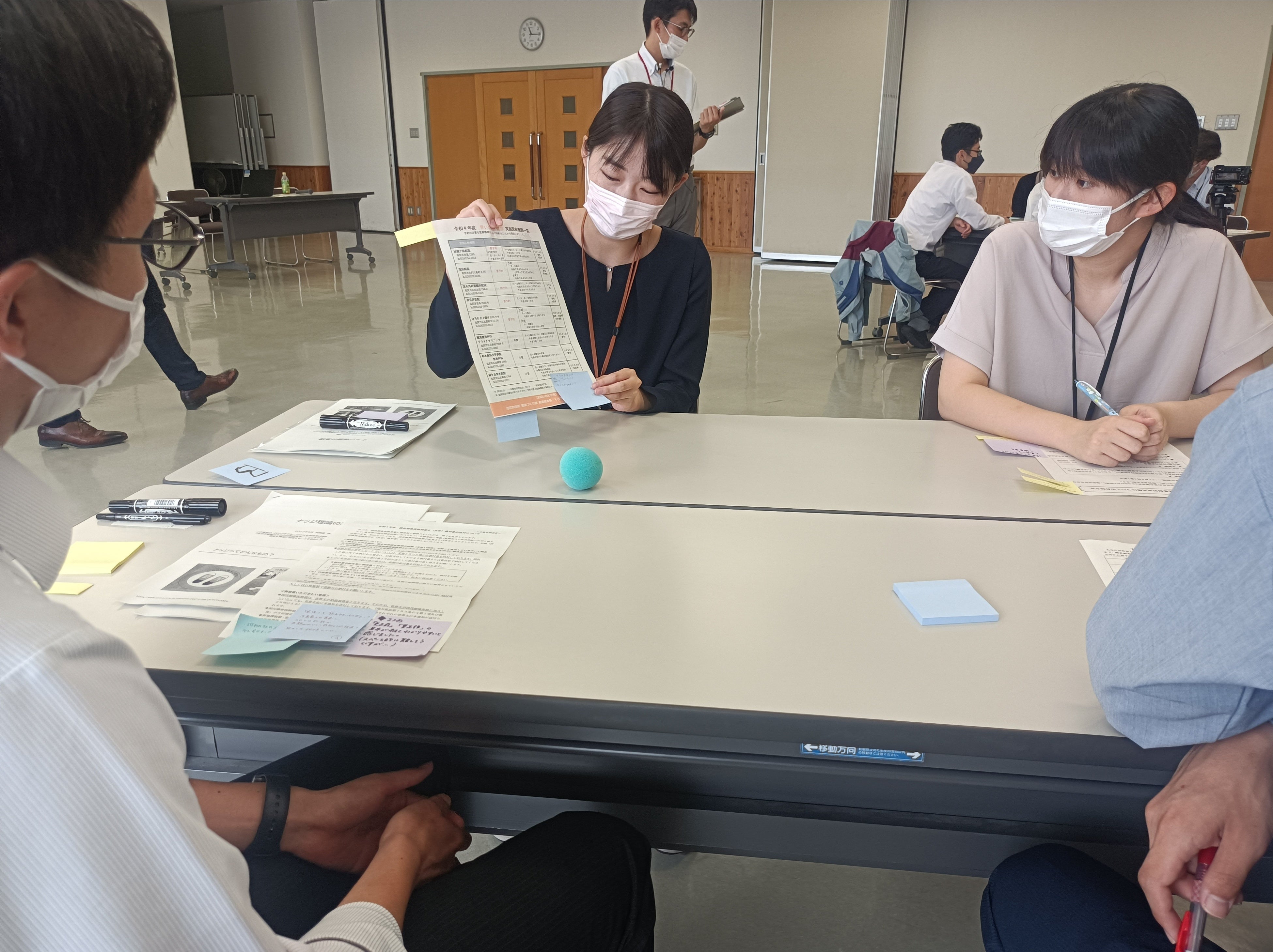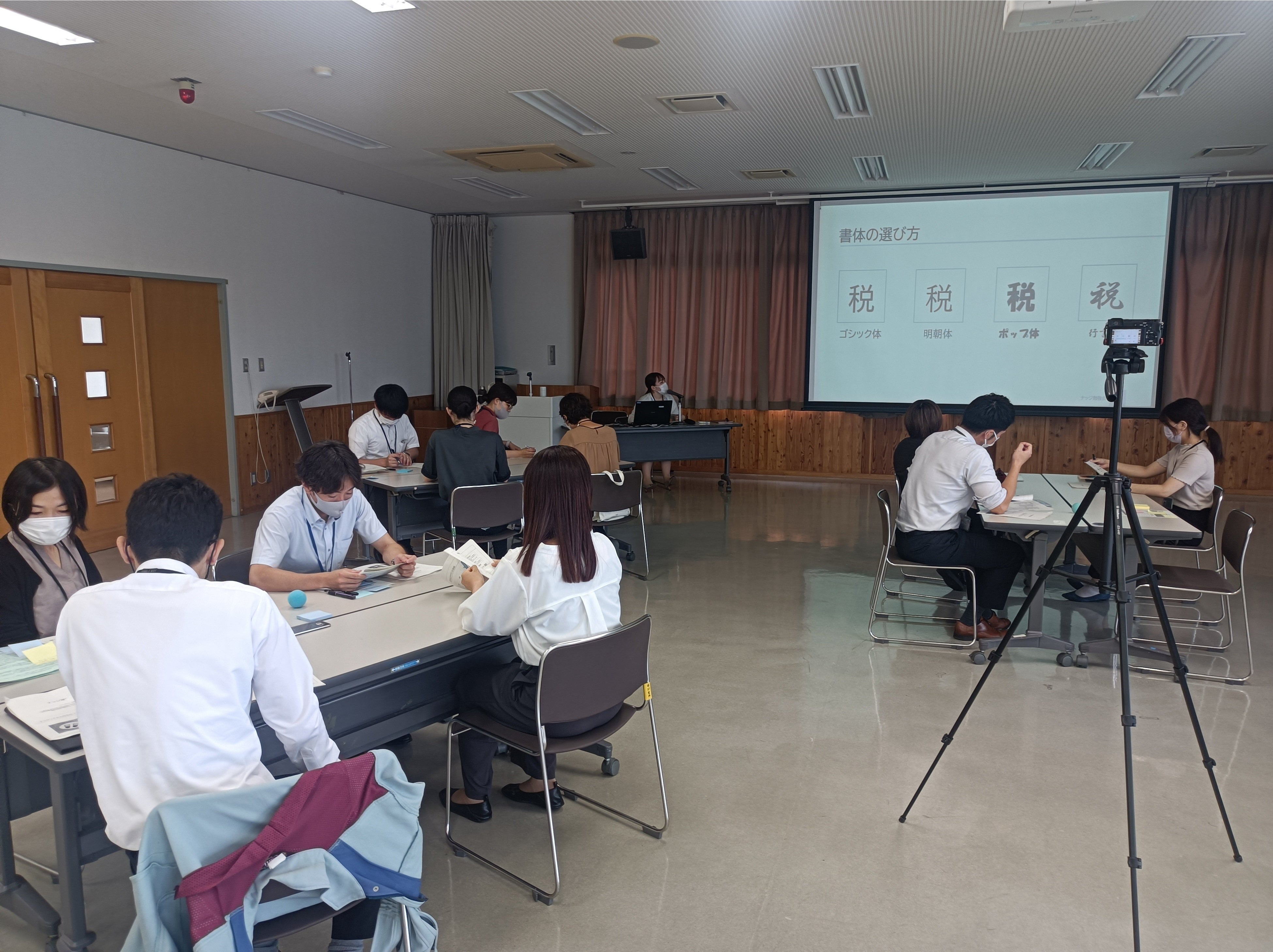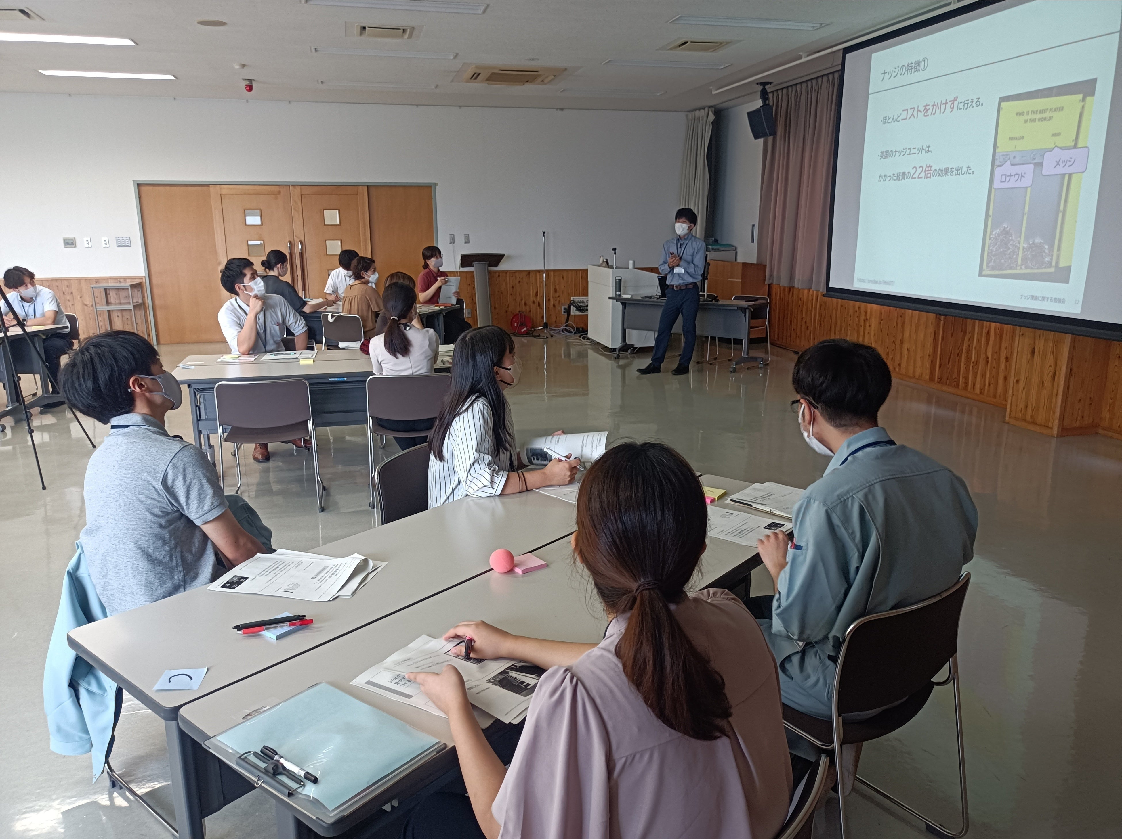 市民課、生活環境課、健康づくり課、長寿課、福祉課、教育委員会、税務課などの20代~30代の職員20名が参加し、講義、グループワーク、実演の三部構成でナッジ理論の知見を深めました。講師は税務課の20代職員3名が務めました。