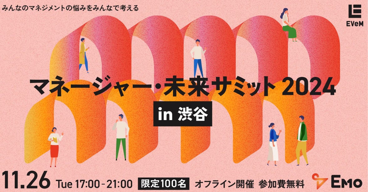 マネージャーイネーブルメントサービスを提供する株式会社EVeM(本社:東京都新宿区 代表:長村禎庸)は、ベンチャーマネージャーが一同に集い、共に組織や自分自身の未来を考える「マネージャー・未来サミット」を2024年11月26日(火)に渋谷にて初開催します。