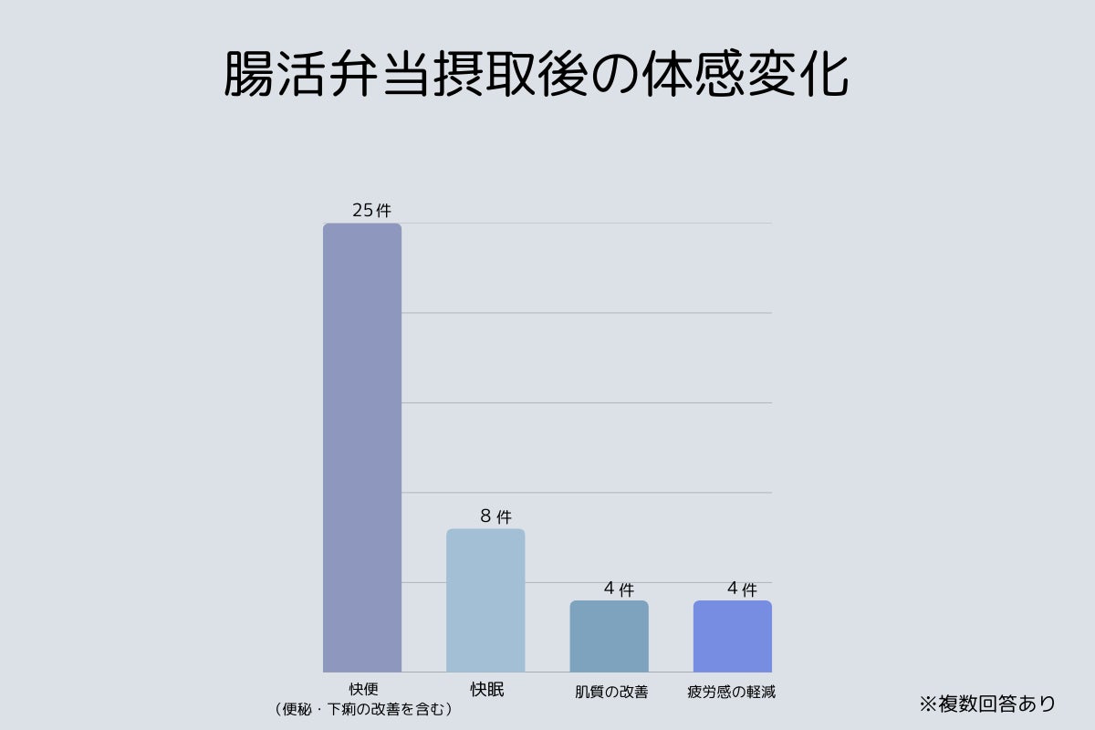 腸活弁当の摂取後に実施したアンケート調査では、49名中41名から体感的な変化があったとの回答が寄せられました(※複数回答可)。