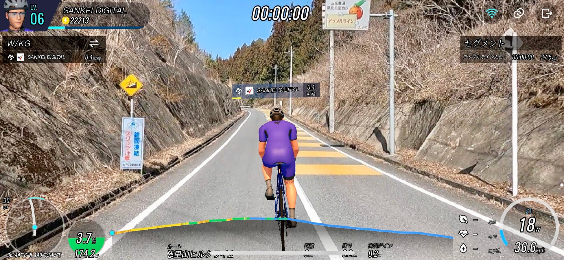 また、勾配データも再現しているため、上り坂ではペダルが重く、下り坂では軽くなり、実際にコースを走ったかのような体験が味わえます。特に「奥久慈里山ヒルクライムルート」は、前半は勾配10%越の激坂があり、走りごたえがあります。