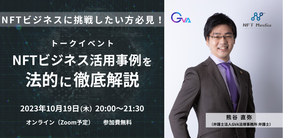 本イベントは、NFT Media出版書籍『NFTビジネス活用事例100連発!』(https://nft-media.net/nft-book1/)に掲載の事例からいくつかの事例を厳選し、それらの事例について熊谷直弥弁護士に法的観点から解説していただきます。