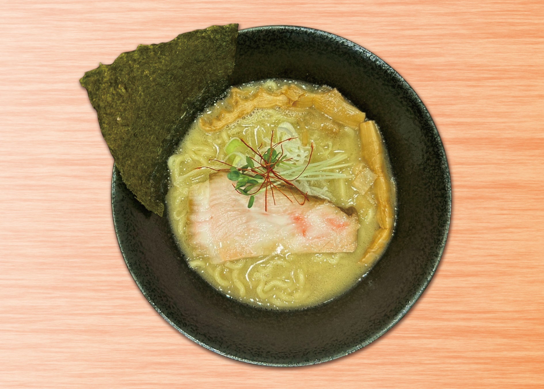 高級食材であるのどぐろを惜しみなく出汁に使った贅沢かつ濃厚な白湯スープに、しなやかな中細平打ち麺を合わせました。ほのかに香る柚子オイルがアクセントに加わった最高級の魚介系ラーメンです。