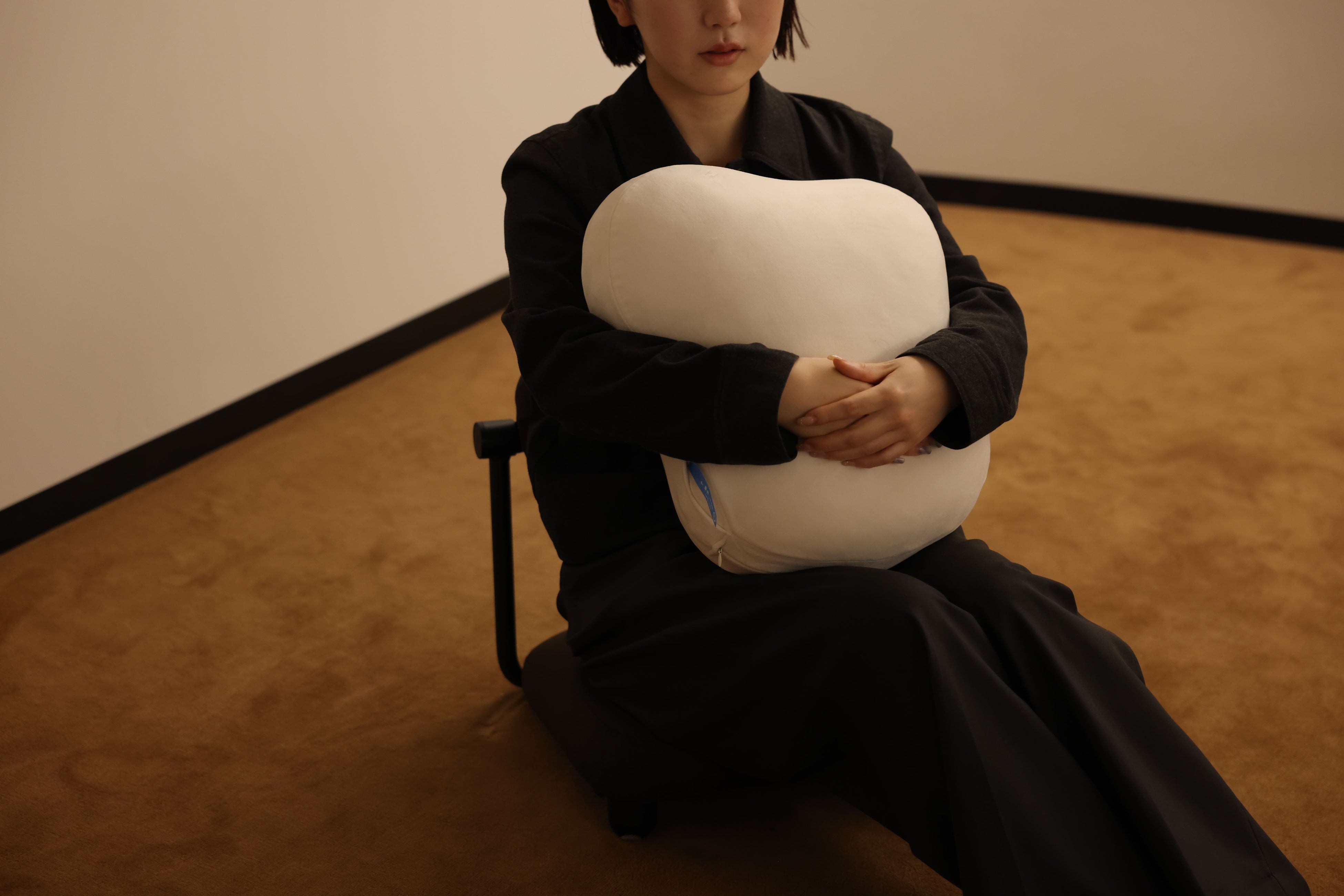 抱きかかえて使う呼吸誘導型のロボットクッション。「呼吸の引き込み現象※1」に注目し、まるで呼吸をするように膨らんだり縮んだりするテクノロジーを活用しています。