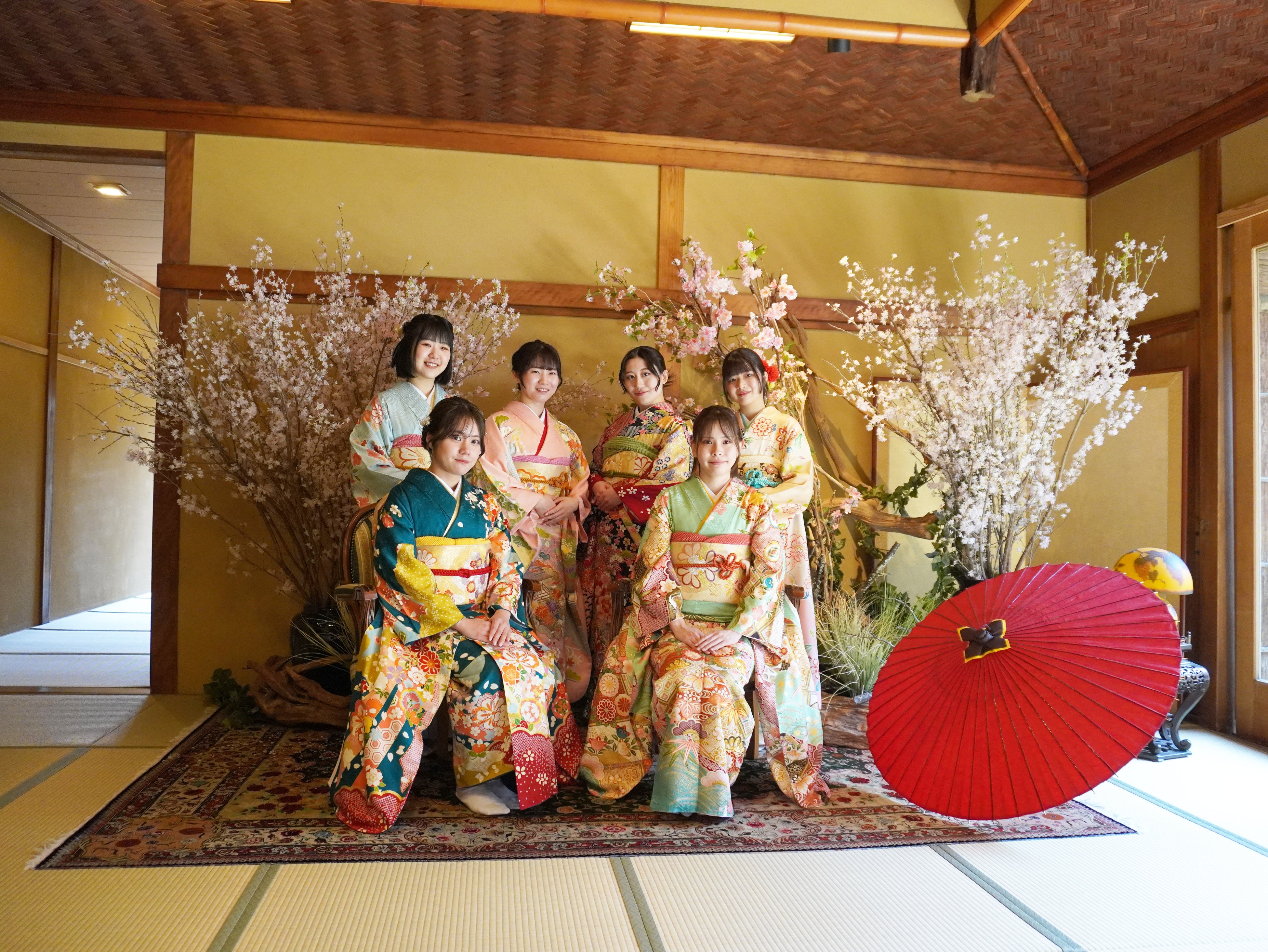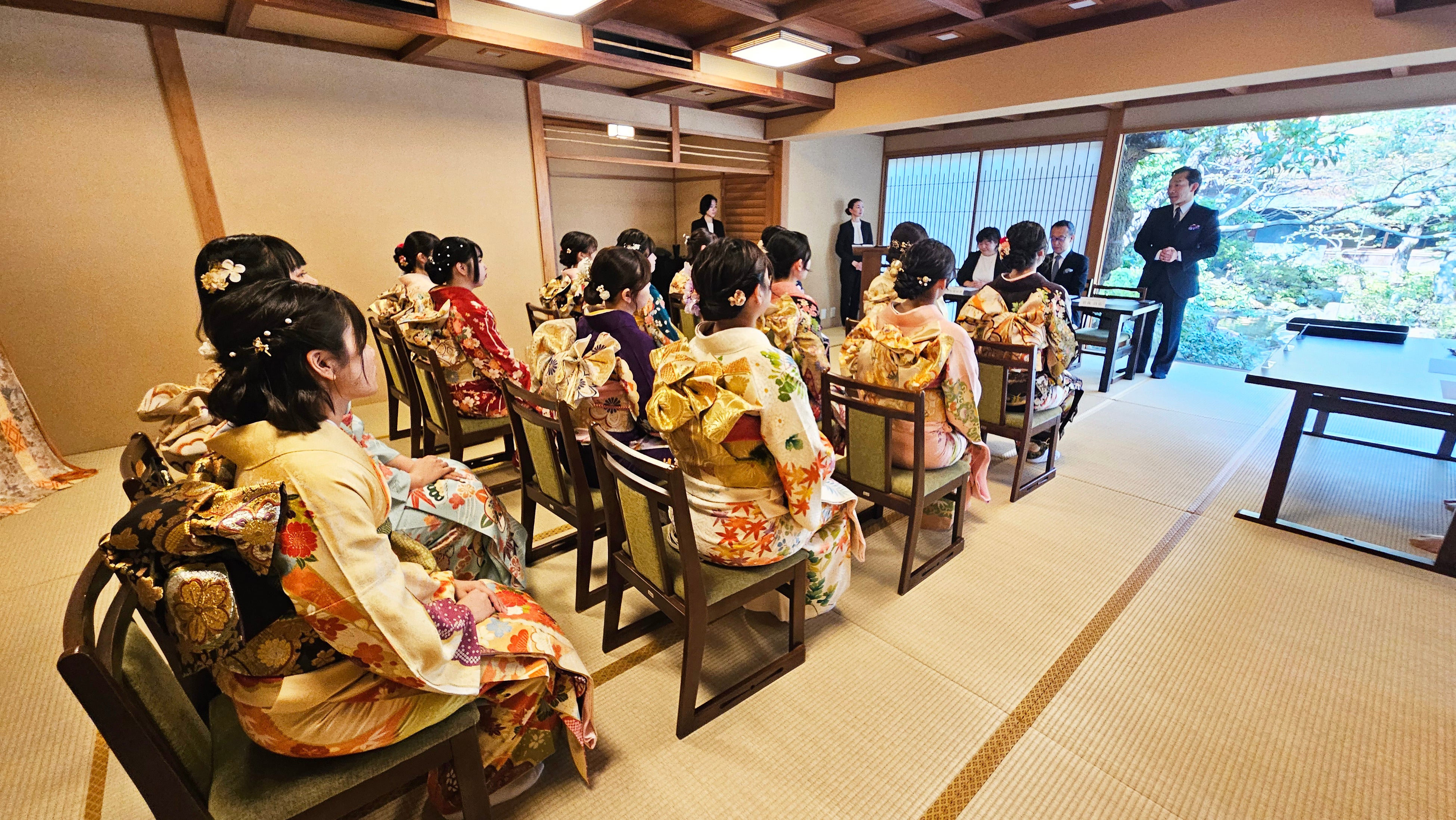本年は当社初、新入社員全員が自社振袖商品を着用し、日本庭園を眺めながらの式典に。着付やヘアセットもグループ会社のbittersweet beautyが担当し、コーディネートから当日の支度までのすべてを、先輩社員の手で整えました。