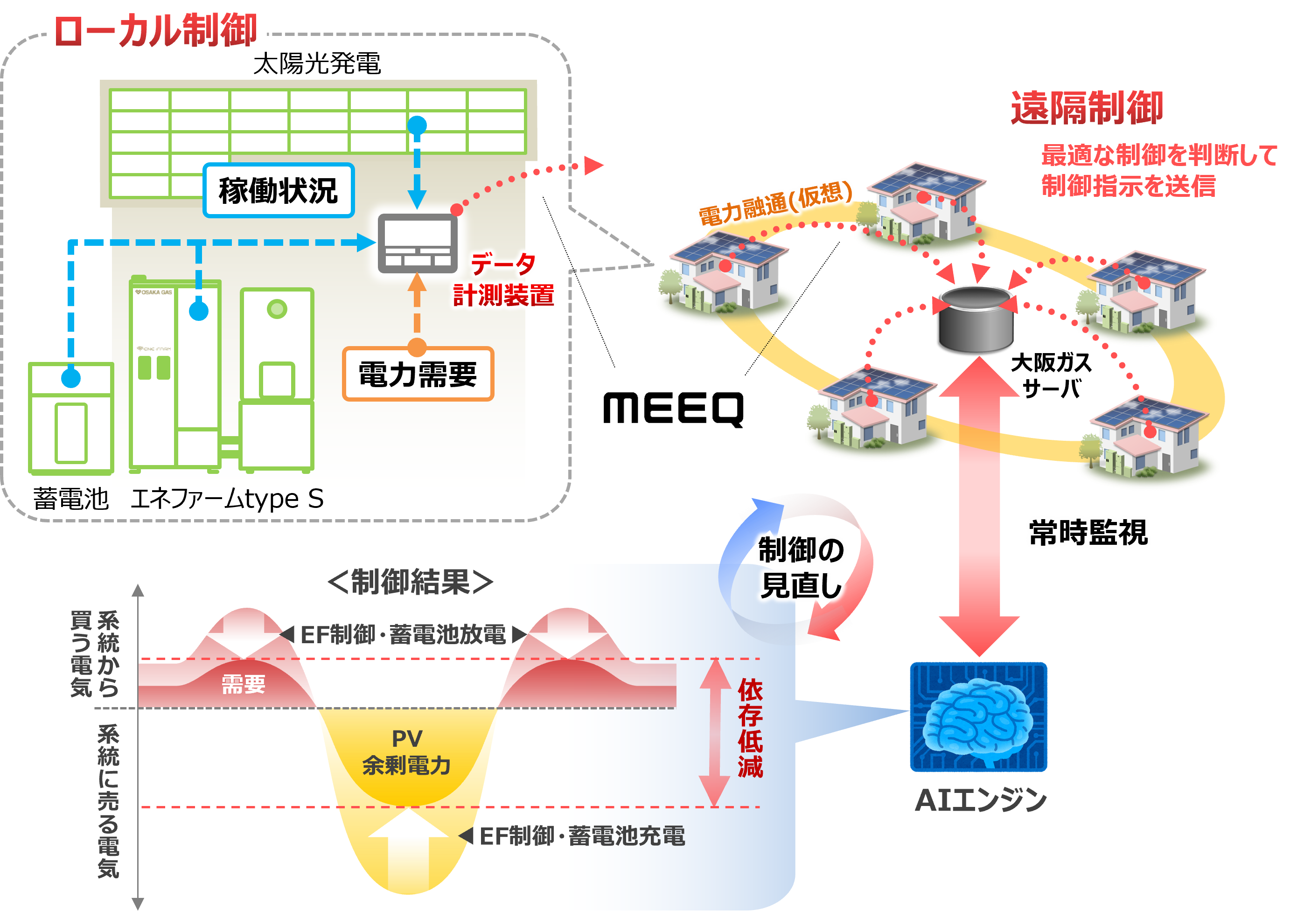 本実証では、神戸市内の約100世帯のお客さま宅を仮想の街区に想定し、サーバからの遠隔制御とお客さま宅内のローカル制御を組合せてエネファームと蓄電池を制御することにより、街区内での再生可能エネルギーを最大限地産地消することを目指した技術検証を行います。これにより、さらなる再生可能エネルギー普及拡大に貢献することを目指します。