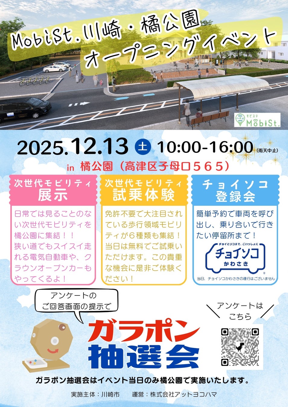 株式会社アットヨコハマ(本社:横浜市神奈川区栄町7-1/代表取締役:上野健彦・宮原漢二 は、川崎市高津区の橘公園で実施している「モビリティ× 地域情報発信の機能を設けたモビリティハブ」の一環として、橘公園にモビリティを集めたオープニングイベントを2025年12月13日(土)に実施いたします。