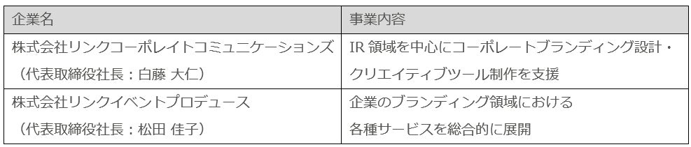 株式会社リンクコーポレイトコミュニケーションズは、2025年1月1日付で、株式会社リンクイベントプロデュースと統合し、新会社(株)リンクソシュールを設立することを決定いたしましたので、下記の通りお知らせいたします。