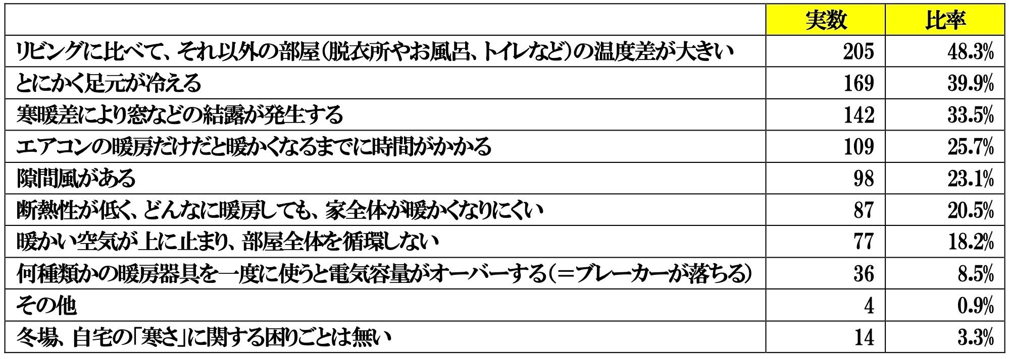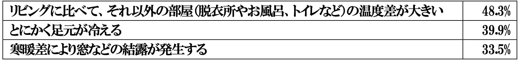 また、一戸建てにお住まいで、冬場、家の中が寒く感じることがある方が63.7%に達しており、困りごととしては、「リビングに比べて、それ以外の部屋(脱衣所やお風呂、トイレなど)の温度差が大きい」が最も多く5割弱となっています。