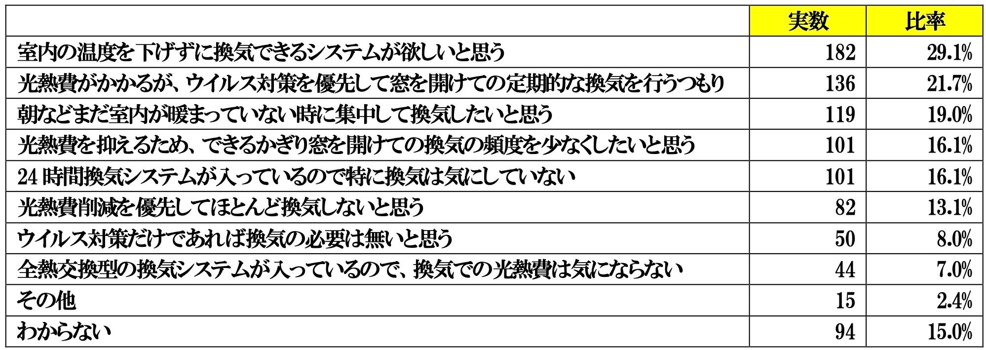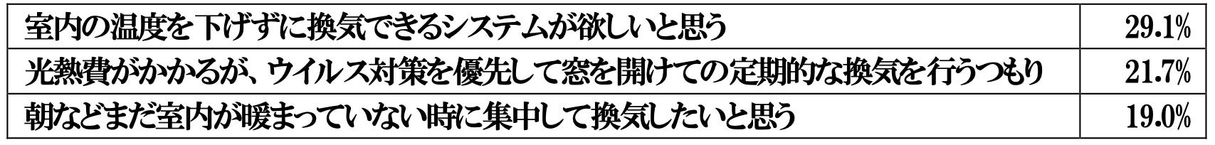 さらに、新型コロナウイルスにより、定期的な換気が求められる中、最もニーズが高いのが「室内の温度を下げずに換気できるシステムが欲しいと思う」で3割弱。「光熱費がかかるが、ウイルス対策を優先して窓を開けての定期的な換気を行うつもり」の方が約2割となっています。