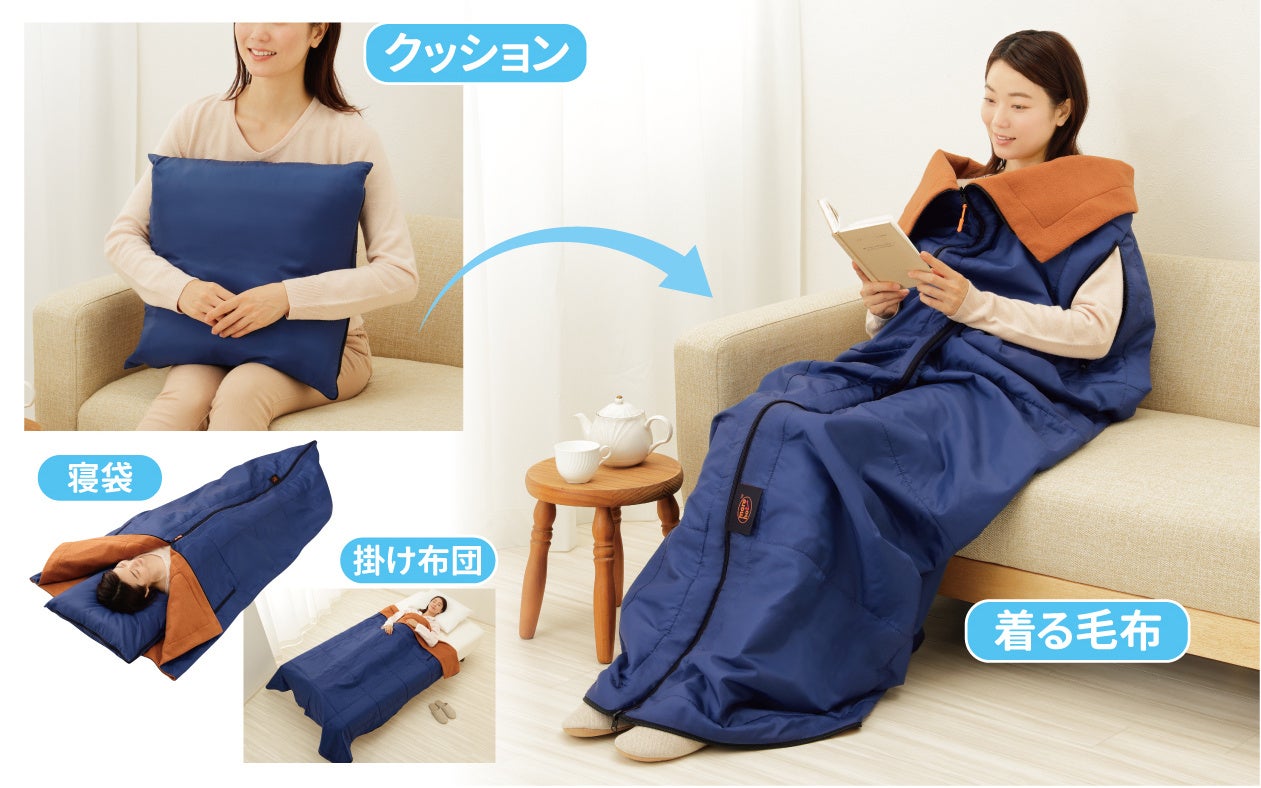 アルミシート内蔵のとても暖かい寝袋。着る毛布や掛け布団、コンパクトにたたむとクッションにも変身。ソファーや車内にクッションとして置いて生活の中で使いながら、「もしも」の時に備えることができる。