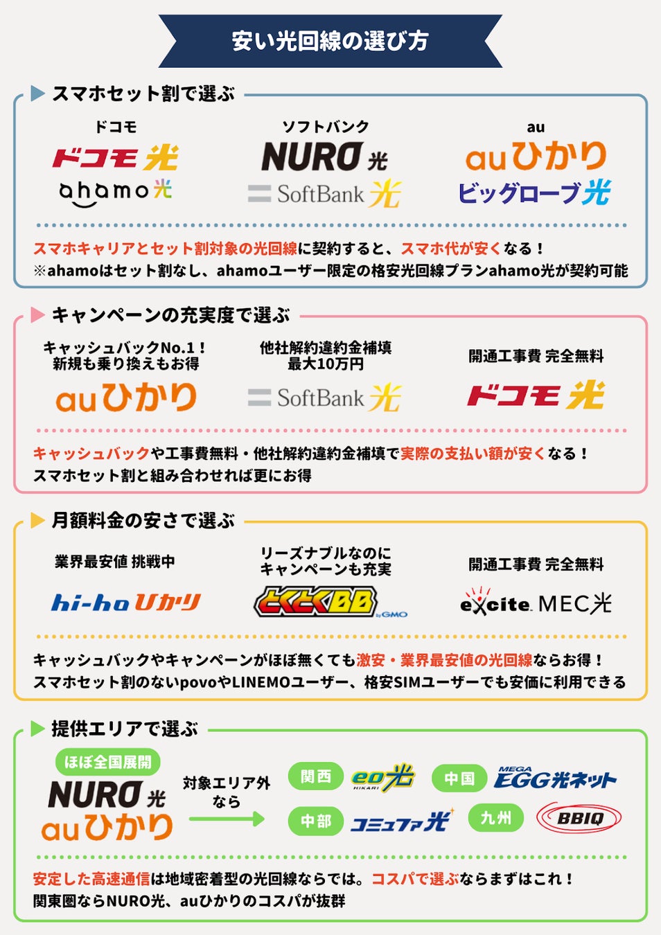 カオスマップだけでは各光回線の詳細やどの光回線が特におすすめなのか把握することは難しいですが、安い光回線の選び方の画像では、ユーザーの状況や選ぶポイントなどについてどの光回線が適しているのか視覚的にわかるように心がけ作成し公開しております。