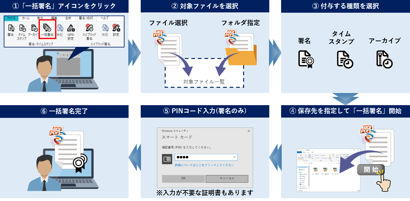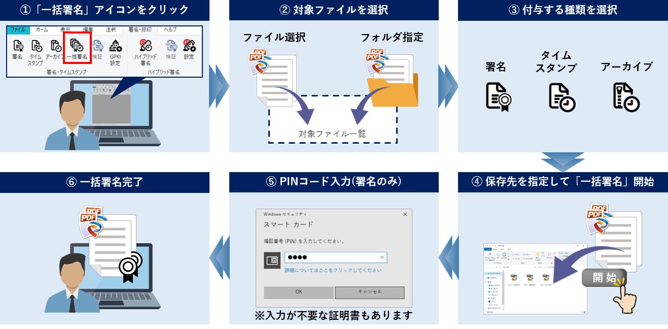 複数のPDFファイルに対し、電子署名やタイムスタンプ、アーカイブタイムスタンプ(長期署名)を簡単操作で一括付与できる機能を追加しました。