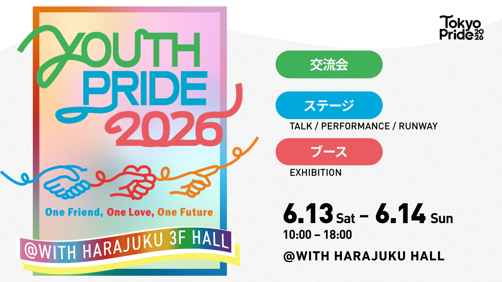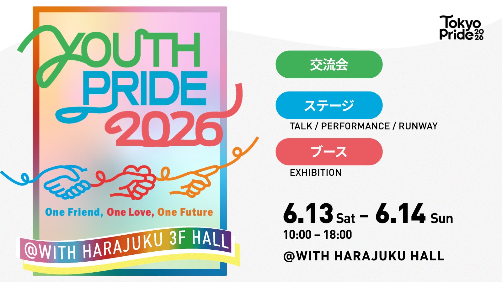 Youth Prideは、全国のユース世代のLGBTQ+当事者やアライがつながり、同世代の仲間と出会うことを目的に開催するイベントです。2026年は「One Friend, One Love, One Future」をコンセプトに掲げ、参加者同士がつながる体験を重視したプログラムを実施します。