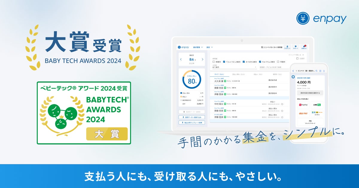 集金業務のキャッシュレス化・DX化を実現するFintech×SaaSプラットフォーム『enpay(エンペイ)』を提供する株式会社エンペイ(本社:東京都港区、代表取締役社長/ファウンダー:森脇 潤一、以下エンペイ)は、「BabyTech® Awards 2024」において、「保育ICT一般部門 大賞」を受賞したことをお知らせいたします。