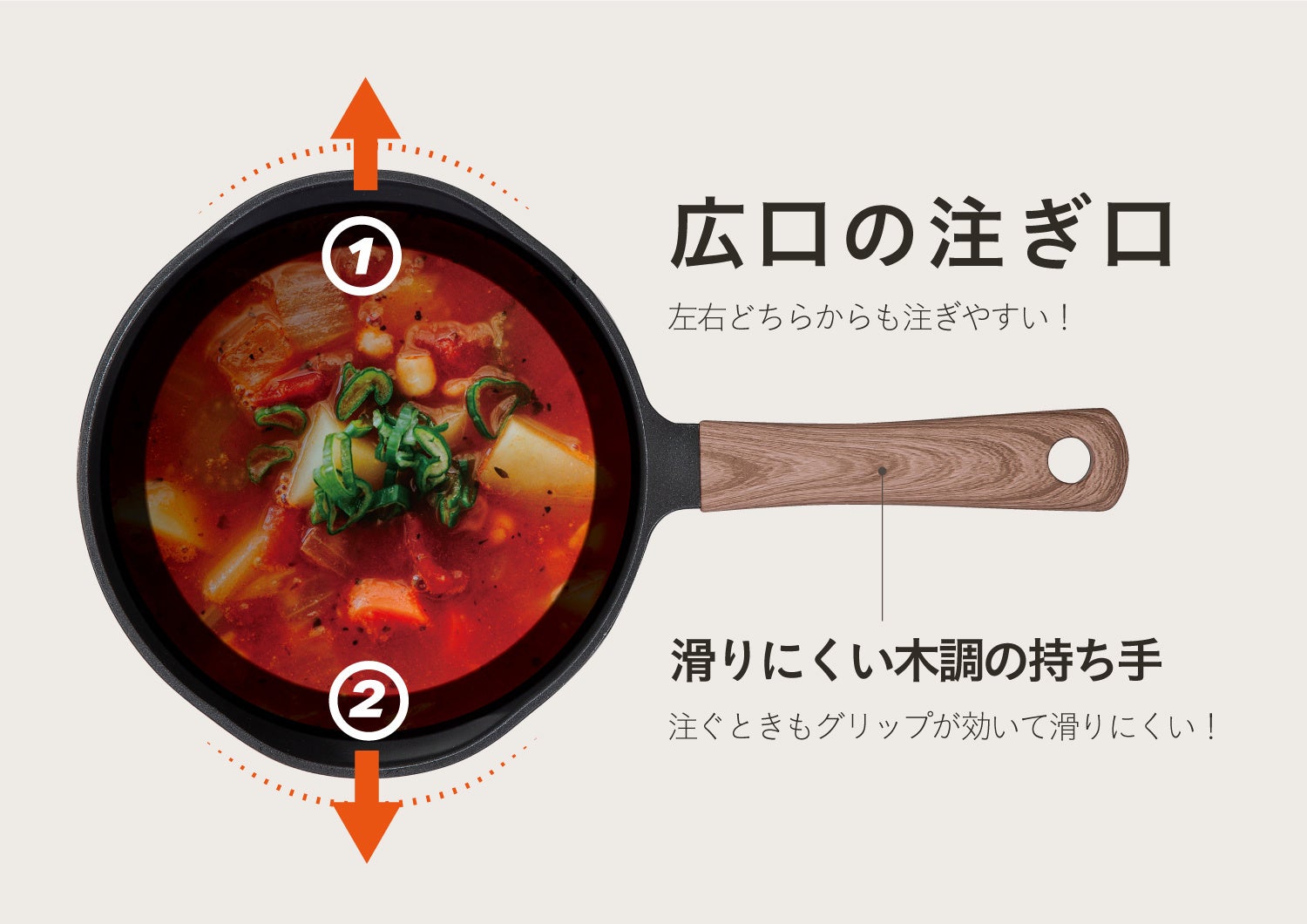 「広い注ぎ口形状」なので、「作った料理をお皿に移し替える時」や「スープやタレをそのままかけたい時」も