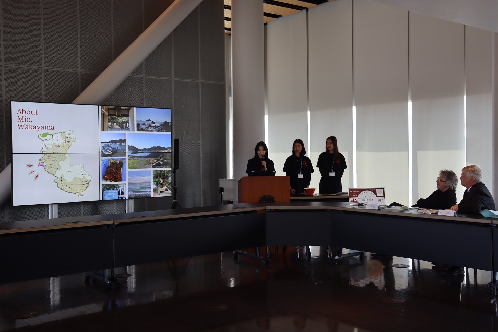 大学関係者との懇談の後、国際貢献学部グローバル観光学科の河上幸子教授が、和歌山県美浜町三尾地区のカナダ移民の歴史に関する研究と、地域活性化の取り組みである「みおラーメンプロジェクト」を紹介しました。続いて、同プロジェクトに参加する学生3人が、活動の歴史やこれまでの取り組みについて動画を交えながら英語でプレゼンテーションを実施。学生たちは、地域と連携した活動の成果や学びについて説明しました。