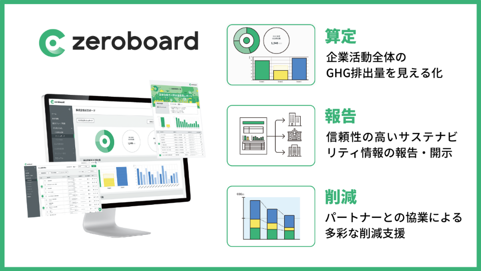 「zeroboard」は、GHG(温室効果ガス)排出量算定・開示・削減までを支援する一気通貫ソリューションです。国内外のサプライチェーン排出量、製品別・サービス別の排出量(カーボンフットプリント:CFP)をクラウドで算定・可視化するほか、削減貢献量や水資源などの登録も可能で、各種レポートの出力にも対応。算定を入り口として、ユーザー企業の課題に合わせたGHG削減ソリューションを提供することで、企業の脱炭素経営を支援しています。