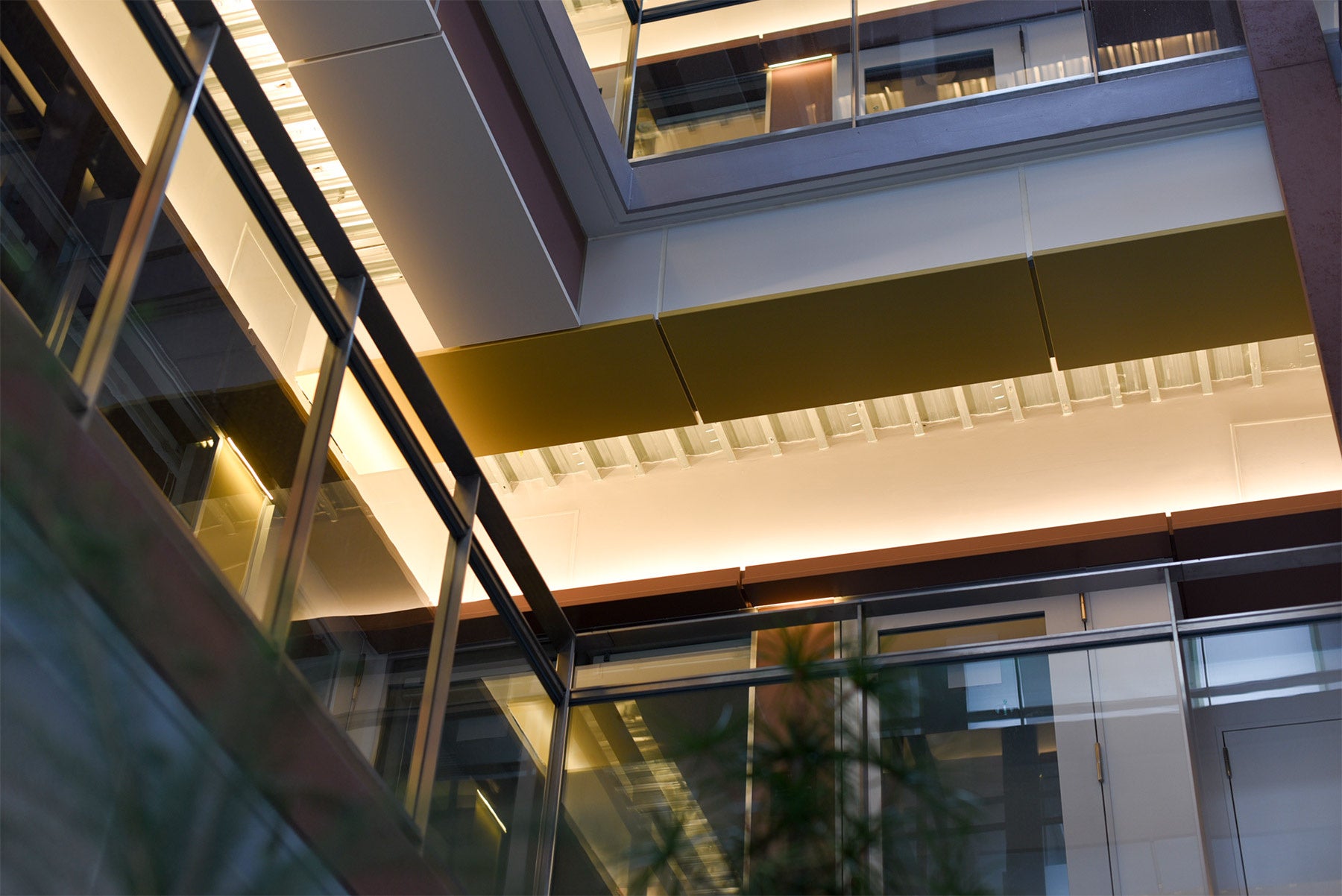 2.緑を感じられる心地よい空間:ビルの4Fから上部は吹き抜けに。隣接する北谷公園が一望できるよう、公園側は全面ガラス張りで自然を身近に感じやすい空間に仕上げました。