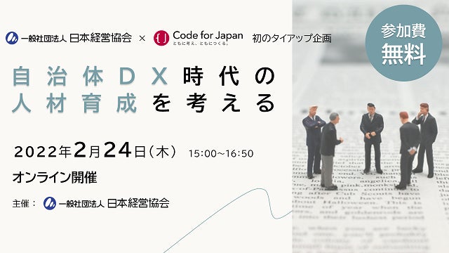 一般社団法人日本経営協会(本部事務局:東京都渋谷区、会長:高原 豪久)は、2022年2月24日(木)に一般社団法人コード・フォー・ジャパン(英語名称:Code for Japan、東京都文京区、代表理事:関治之)とタイアップし、自治体DXがテーマの参加型オンラインイベントを、「第30回講師・内容説明会」内において実施いたします。