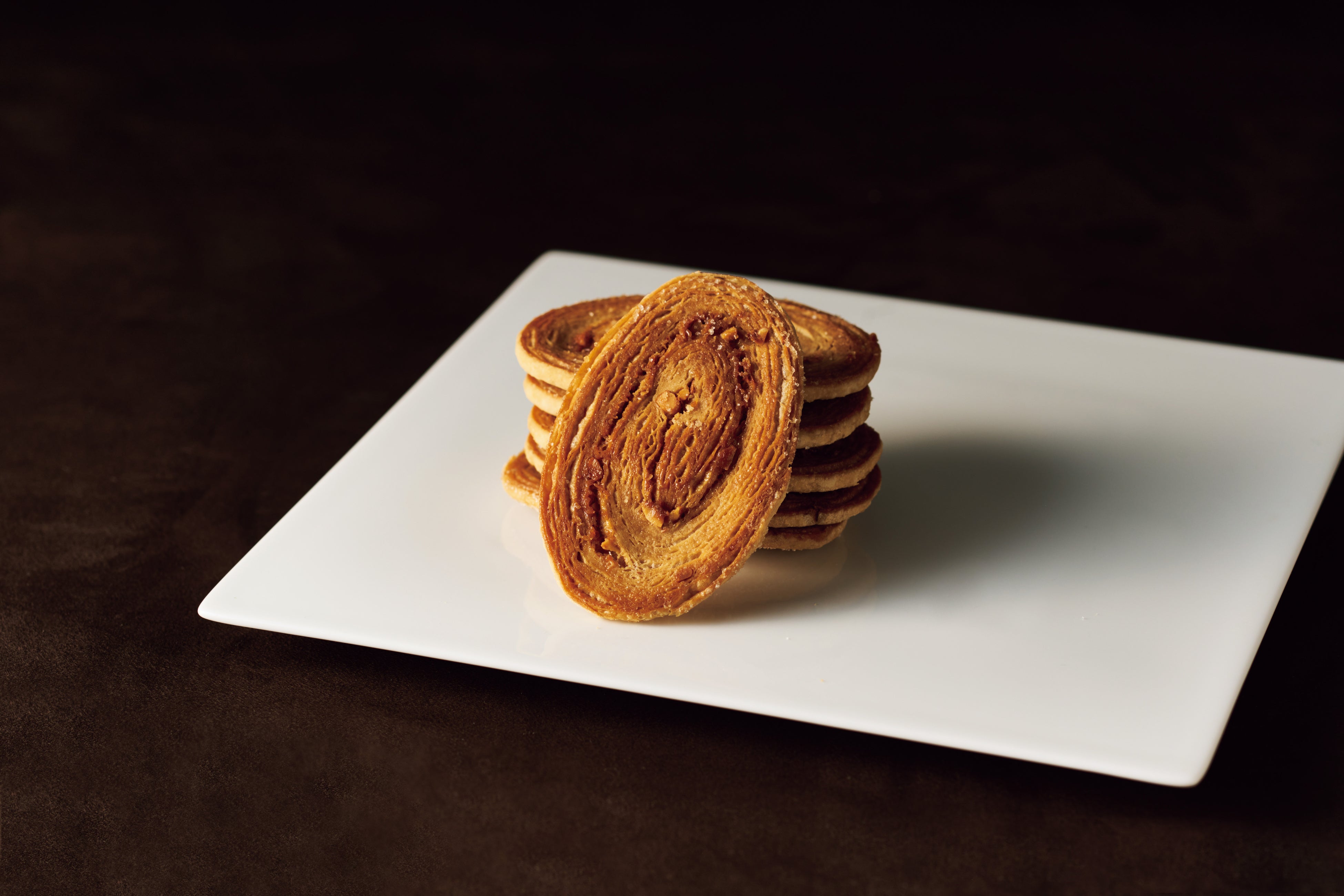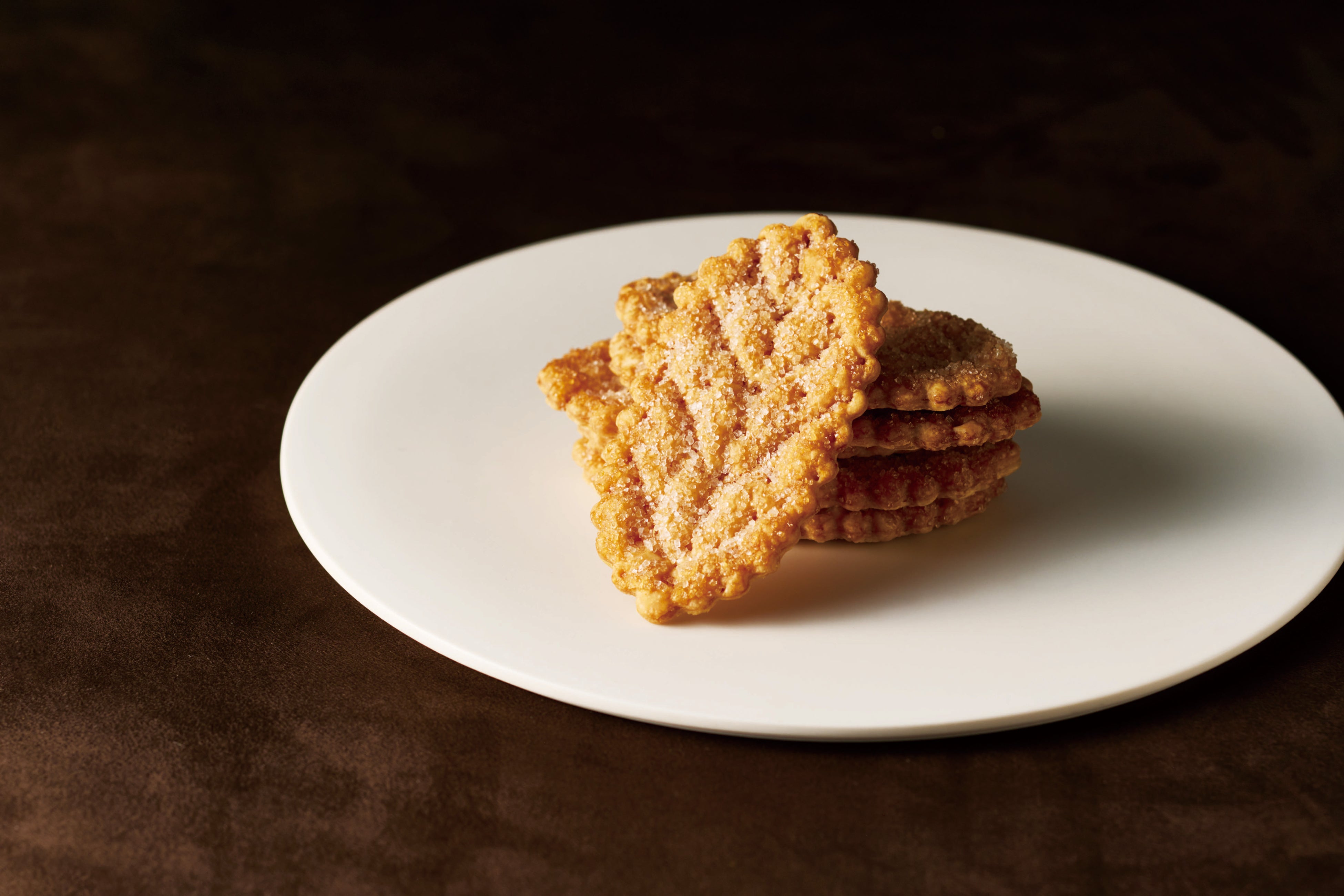発酵バターを40%以上使用し、食べやすいリーフ型に仕上げた贅沢な逸品。一般的なパイ生地と異なり、バターで生地を包んでいく『逆折り込みパイ生地(フィユタージュ・アンヴェルセ)』という特別な製法で作られているため、サクサク・ホロホロとしたパイの食感と、口いっぱいに広がるバターの風味をお楽しみ頂けます。
