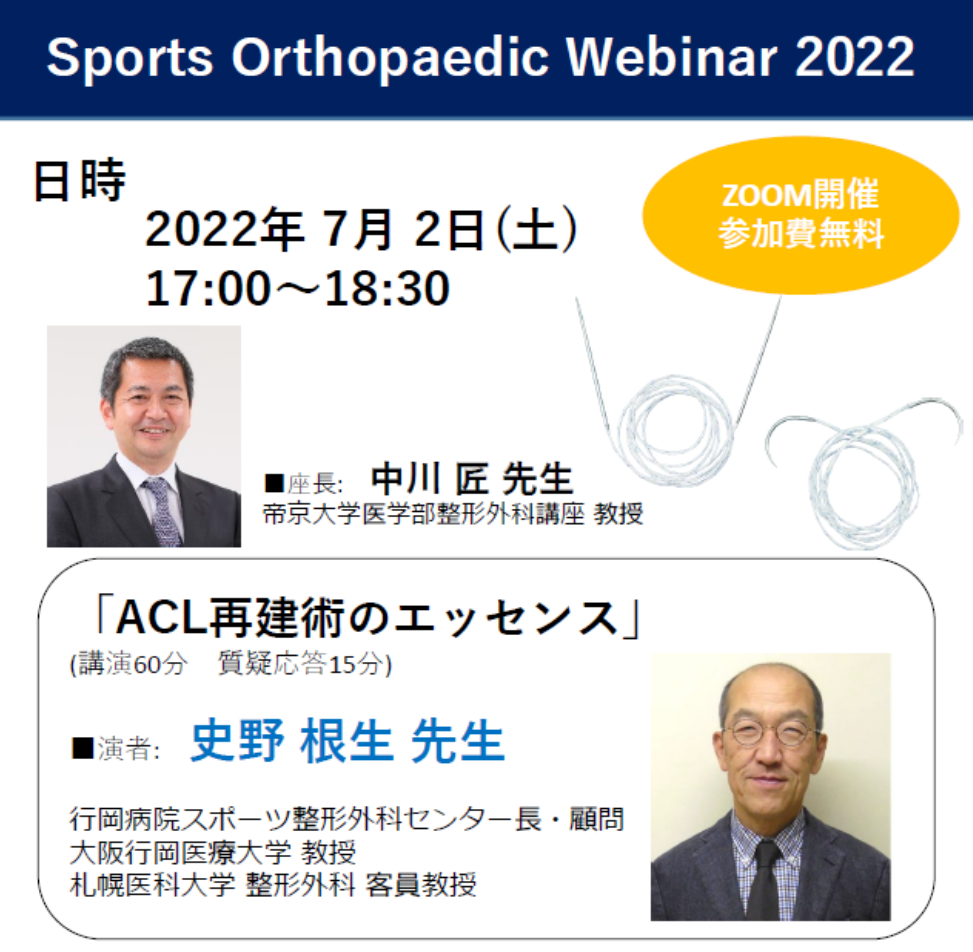 今回のSports Orthopaedic Webinar 2022は、昨年11月の史野先生、中川先生によるウェビナーに続く、2回目のウェビナーになり、前回からアップデートした内容のご講演となっております。史野先生の最新術式のお話しを伺える貴重な機会です。皆さまのご参加をお待ち申し上げております。