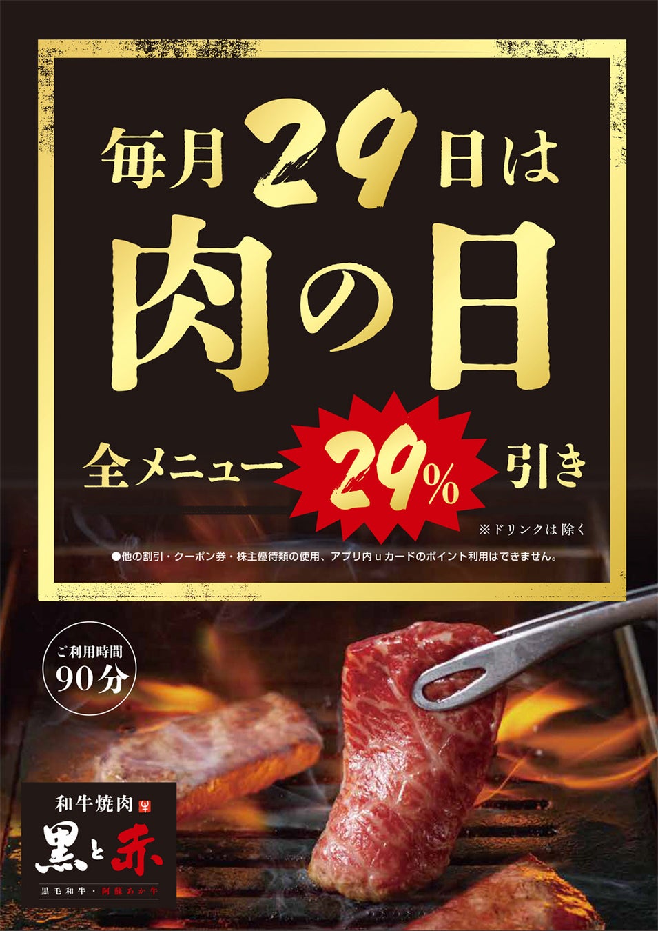 「和牛焼肉 黒と赤」毎月29日は肉の日!!