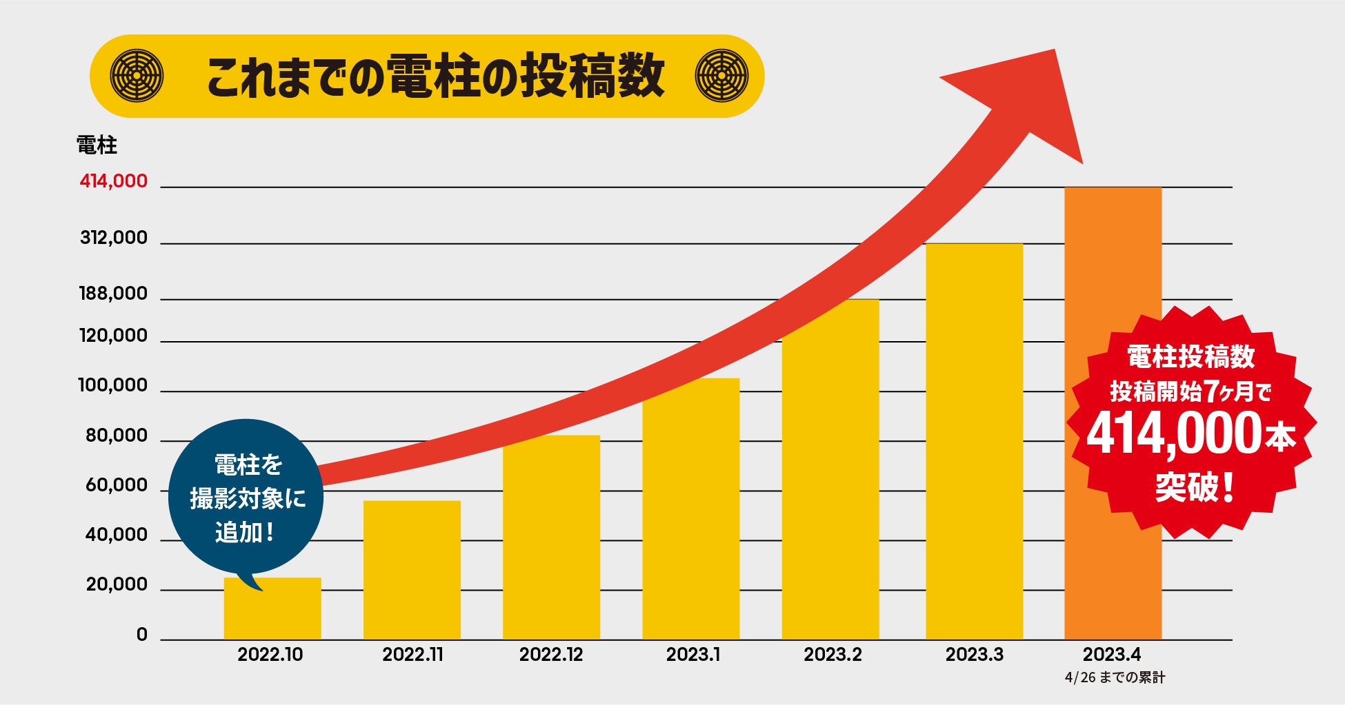 また新たなインフラ撮影対象として昨年10月から加わった電柱は、40万本を超えるデータが集まっています。30万本を突破したのが3月26日で、1ヶ月も経たずに10万本以上の電柱が撮影されました。