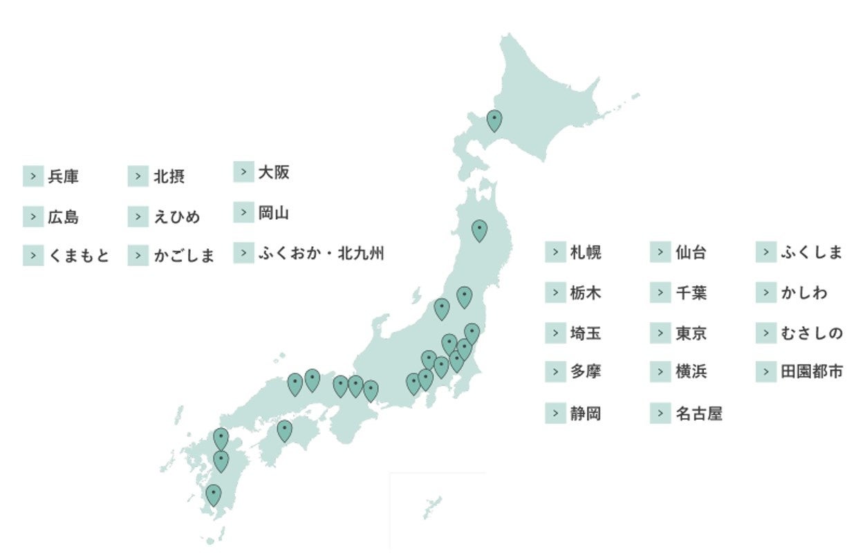 札幌、仙台、ふくしま、栃木、千葉、かしわ、埼玉、東京、むさしの、多摩、横浜、田園都市、静岡、名古屋、大阪、北摂、神戸、岡山、広島、えひめ、ふくおか・北九州、くまもと、かごしま