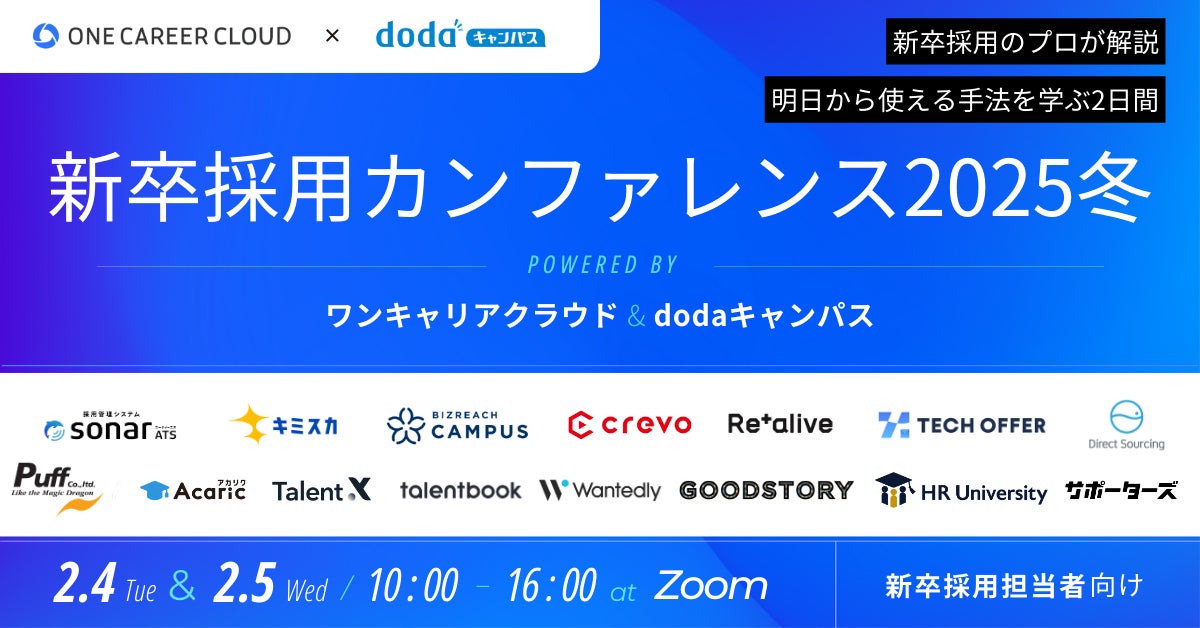 【2月4日(火)・5日(水)開催】WEBセミナー『新卒採用カンファレンス2025冬 powered by ワンキャリアクラウド&dodaキャンパス』登壇のお知らせ