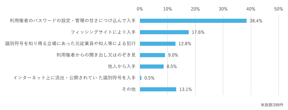 近年、新型コロナウイルス感染拡大による働き方の変化に伴い、DX(デジタルトランスフォーメーション)推進が急務となり、クラウドサービスを利用する企業が増えています。クラウドサービスの導入で課題となるのが、アカウント情報の流出や不正アクセスです。2022年4月に警察庁、総務省、経済産業省が発表した不正アクセス行為の手口別の内訳(※)では、「利用権者のパスワードの設定・管理の甘さにつけ込んで入手」が最も多く、次いで「フィッシングサイトより入手」「識別符号を知り得る立場にあった元従業員や知人等による犯行」と続いています。