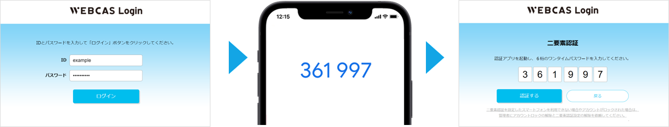 WEBCASシリーズの主要サービスにおいて、管理画面へのログイン時に従来のIDとパスワードの入力に加えて、スマートフォンアプリのワンタイムパスワードを使った二要素認証を可能としました。ワンタイムパスワードとは使い捨てのパスワードであり、一定時間 (数十秒程度) で自動更新され再利用ができない仕組みになっています。このため、第三者の不正ログインを阻止できる可能性が高まります。