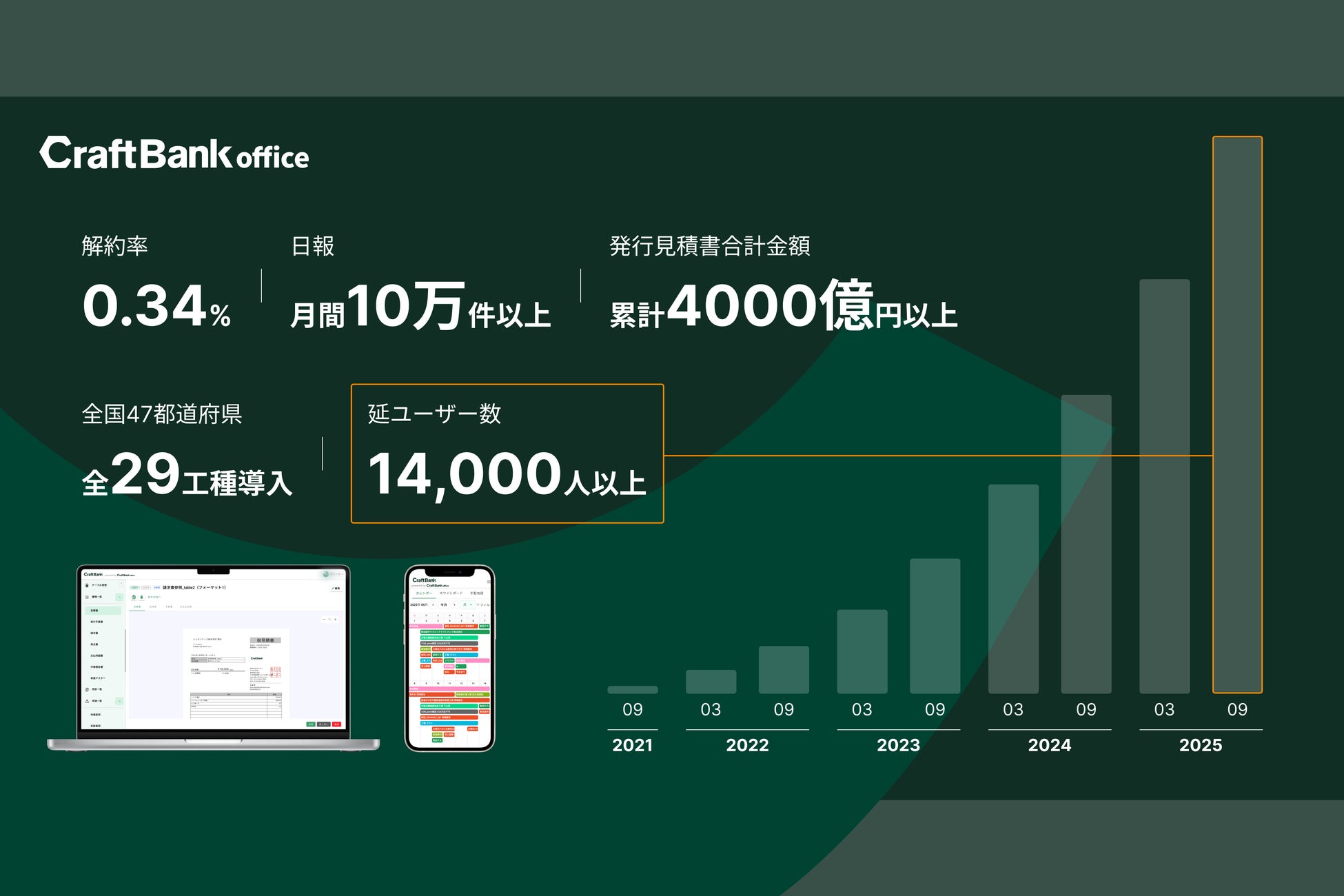 当社が提供する経営管理SaaS『クラフトバンクオフィス』は、サービス提供からわずか4年で全国47都道府県・全29工種に導入が拡大。14,000人を超える職人が日常的に利用し、高い定着率を実現しています。さらに、累計4,000億円超の見積書、月間10万件を超える日報等、これまでアナログで管理されていた日々の行動データの蓄積が進み、業務の可視化・標準化・経営改善に活用されています。