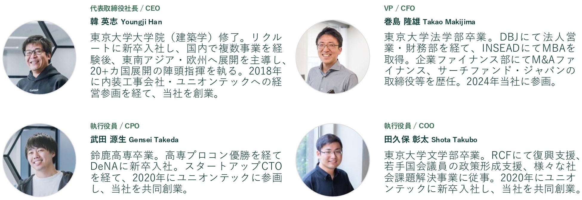 クラフトバンクとは2021年からご一緒させていただいています。韓さんの知見と度量、チームの建設業界への熱い思いに惚れ込んできました。そしてそのプロダクトが、建設業界の生産性改善に力強く貢献している手応えを感じています。すでに存在感を確立しつつも、成長のポテンシャルはむしろこれからが本番です。この業界の人材不足は、日本が他の先進国に先んじて直面しているテーマであり、事業が世界にも広がる可能性を秘めています。クラフトバンクの次のステップに、志を同じくする頼もしい投資家の皆さまとご一緒できることを、心から誇らしく楽しみに感じています。