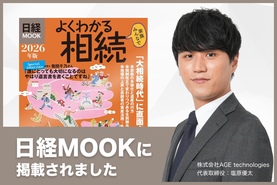 株式会社AGE technologies(本社:東京都新宿区、代表取締役CEO:塩原 優太)は、当社が提供するオンライン相続手続きサービス「そうぞくドットコム」が、日本経済新聞出版発行の日経MOOK特集企画にてタイアップ記事として掲載されたことをお知らせします。
