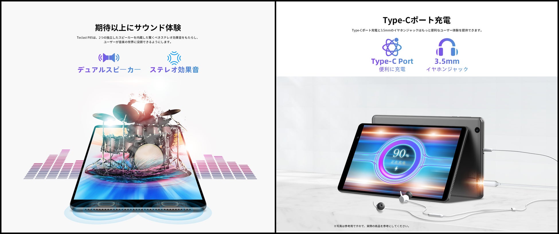 【P85】タブレットはデュアルスピーカーデザインを採用しています。期待以上のサウンド体験は可能です。音を公開できない場所でも、有線ヘッドホンを接続して音を聞くことができます。Type-Cポートで充電できます。より便利なユーザー体験も提供できます。