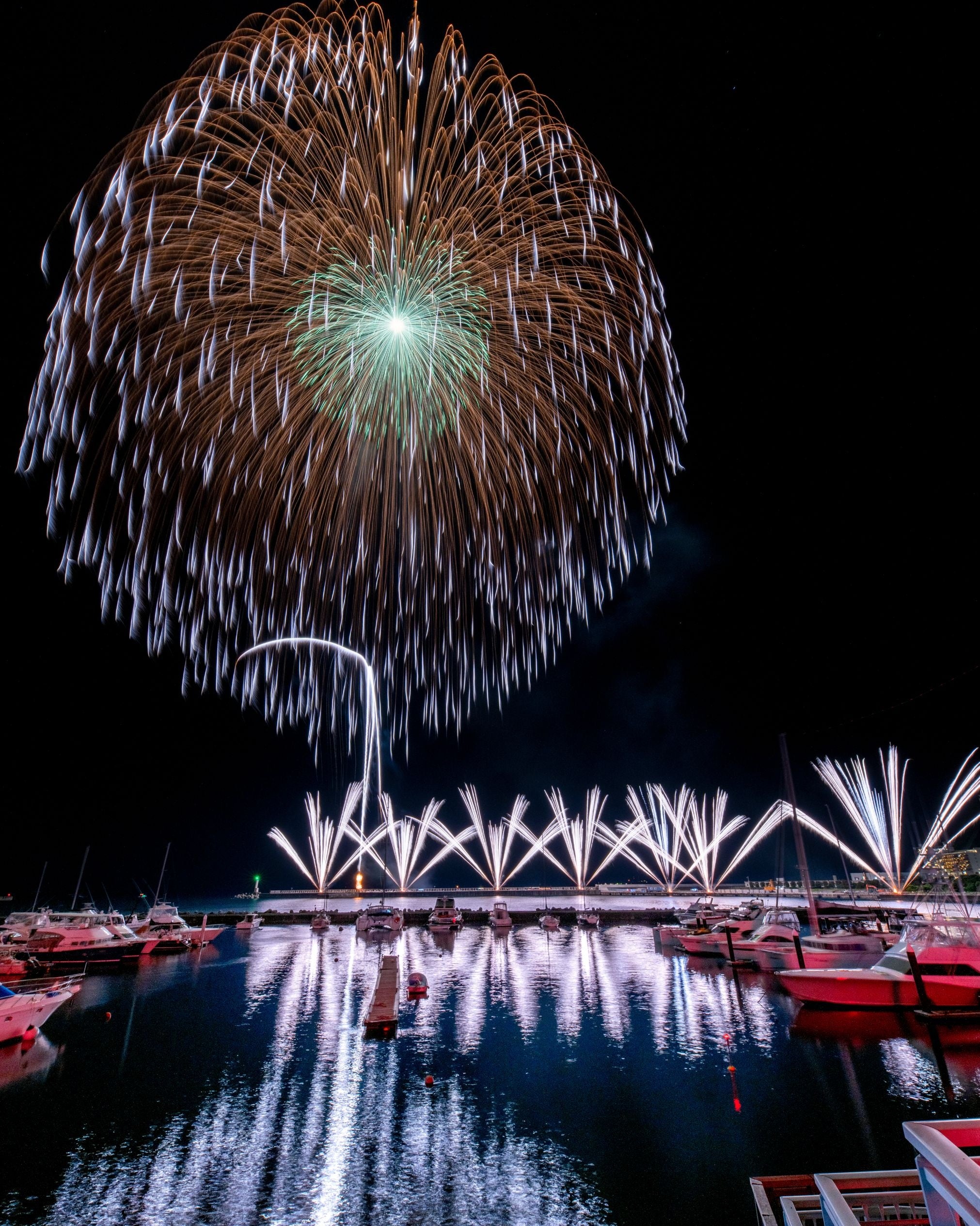 熱海海上花火大会は、1952年(昭和27年)にはじまった歴史ある花火大会。夏だけではなく年間を通して15回以上も開催されている熱海名物の花火大会です。夜空に広がる花火や、水面に映る花火、そして、フィナーレを飾る「大空中ナイアガラ」の美しさは、瞬きを忘れるほど!心にずっと残る思い出ができる、熱海海上花火大会ならではのイベントです。