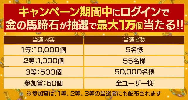 2022年5月3日(火)15:00~2022年5月10日(火)23:59までの期間内にゲーム内にログインすると、1等「1万個」、2等「1,000個」、3等「500個」、参加賞「50個」のいずれかの金の馬蹄石がプレゼントボックスに配布されます。