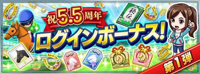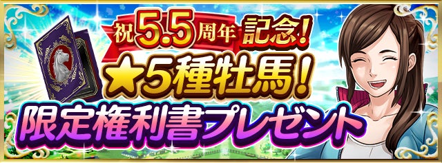2022年4月27日(水)メンテナンス後から2022年5月30日(月)23:59までの期間内にゲーム内にログインすると、特定の★5種牡馬を種付けできる「5.5th記念 ★5種牡馬限定種付け権利書」を555枚、特定の凄馬を種付けできる「5.5th記念 凄馬 限定種付け権利書」を35枚、特定の超凄馬を種付けできる「5.5th記念 超凄馬 限定種付け権利書」を20枚獲得できます。