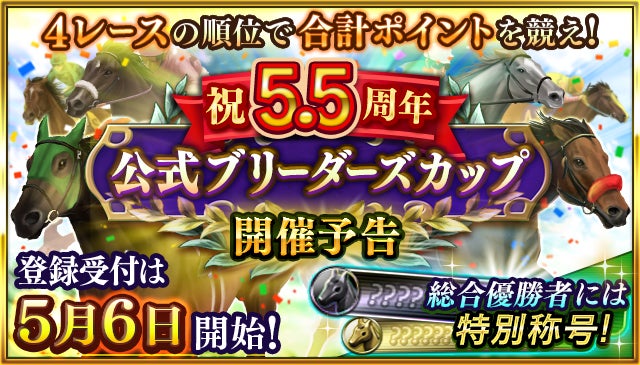 4つのレースの順位で獲得できるポイントを合計して総合順位を競う「祝5.5周年 公式ブリーダーズカップ」の登録受付を2022年5月6日(金)12:00から開始します。