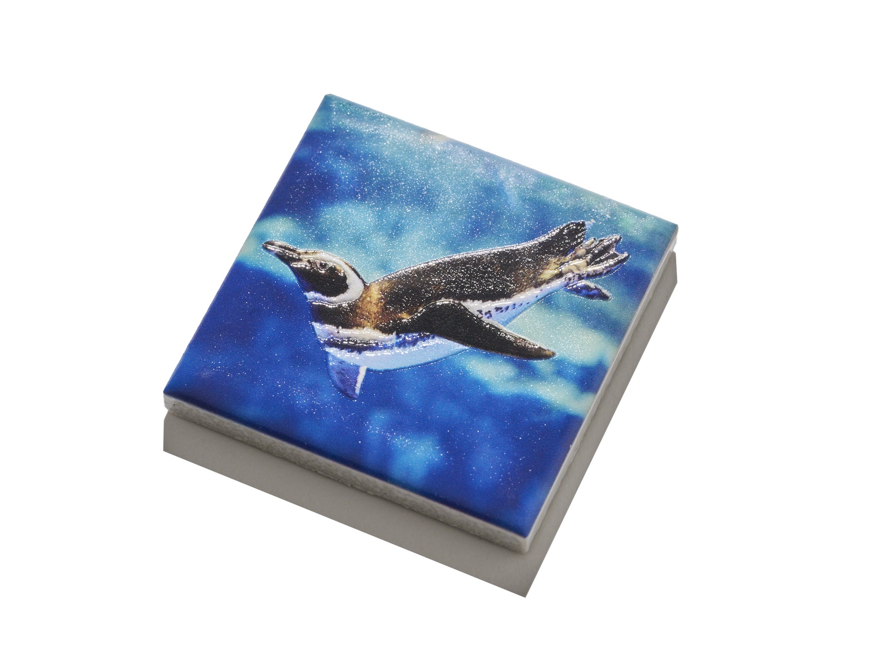 マゼランペンギンたちがフリッパー(翼)を広げて羽ばたくように泳いでいる姿は、まるで空を飛んでいる鳥のように見えます。ペンギンの羽毛の質感や、後ろにピンと伸ばした足、尾羽の形に凹凸をつけて、躍動感あふれる姿を立体化しました。水中をロケットのようなスピードで自由に泳ぎ回る、ペンギンの生き生きとした姿をお楽しみください。