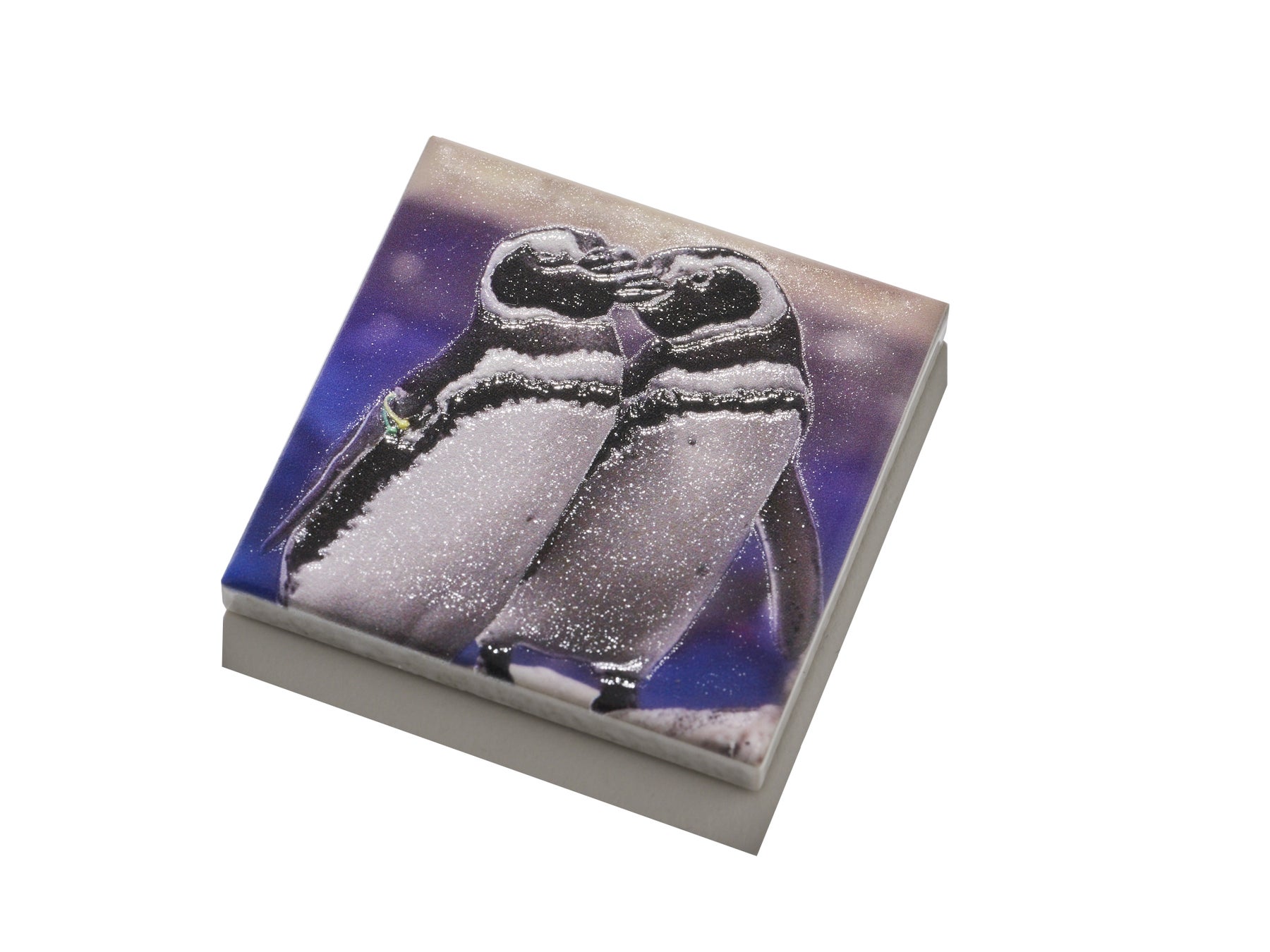 マゼランペンギンは基本的に生涯同じパートナーと添い遂げるといわれています。カップルが仲良く寄り添う姿は、なんとも微笑ましい光景です。マゼランペンギンの特徴である胸にある黒の2本ラインと、顔を取り囲む白いライン、おなかの丸いシルエットにも凹凸をつけて立体化しています。仲睦まじい2羽の慈愛に満ちた表情にもご注目ください。